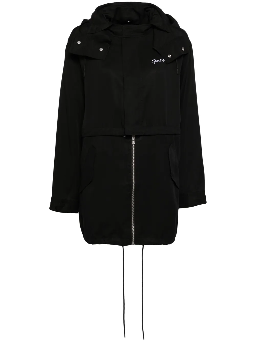noirTENCEL™ fermeture à zip et boutons sur le devant logo brodé sur la poitrine capuche à lien de resserrage attaches élastiques poches latérales boutonnées panneaux détachables