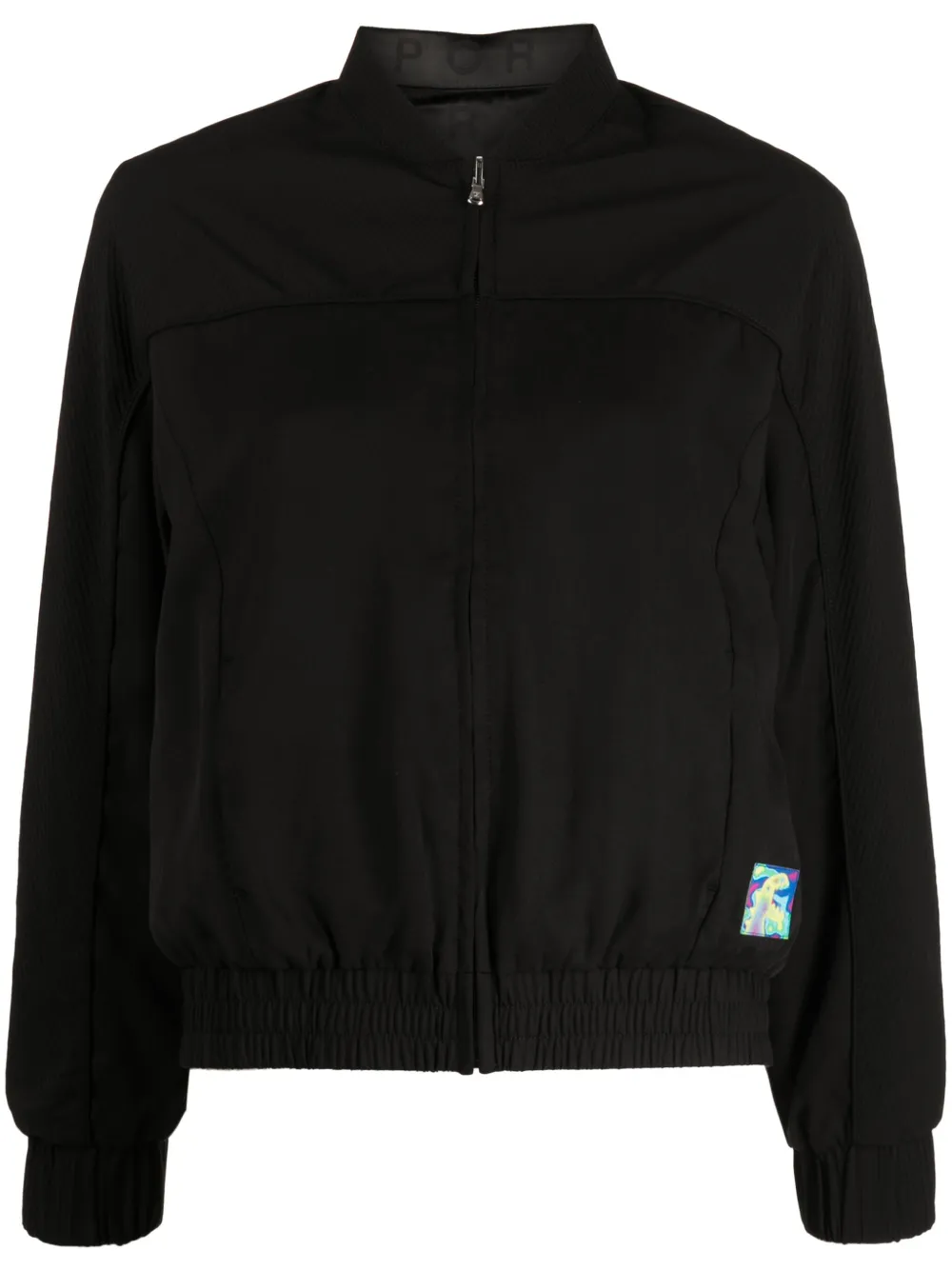 Noir, patch logo sur le devant, col montant, fermeture zippée devant, manches longues, poignets élastiqués, ourlet élastiqué.