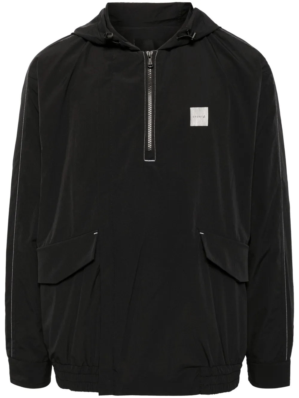 noir fermeture zippée devant logo imprimé sur la poitrine capuche à lien de resserrage coutures contrastantes deux poches boutonnées sur le devant poignets boutonnés ourlet élastiqué
