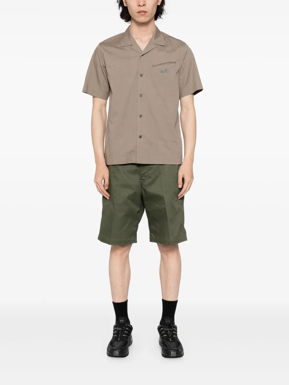 bruin knoopsluiting aan de voorkant klassieke kraag paspelzak op de borst korte mouwen