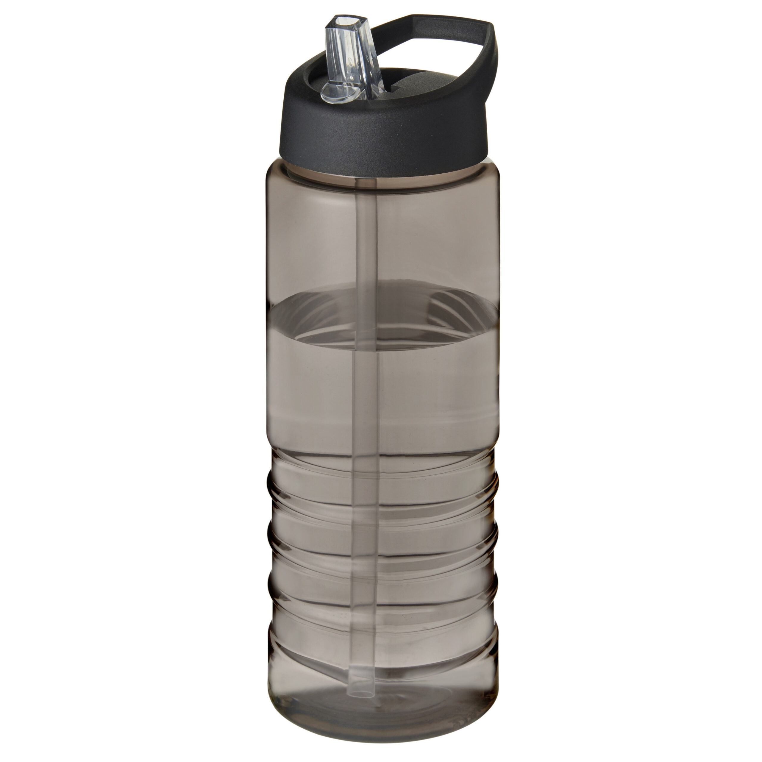 Sport bidon/drinkfles/waterfles gemaakt van gerecycled Hi-eco kunststof in de kleuren donkergrijs/zwart met een inhoud van 750 ml. Met handige tuit-deksel. Enkelwandige drinkfles met geribbeld ontwerp gemaakt van Prevented Ocean Plastic. Het plastic wordt verzameld binnen een straal van 50 km van een oceaankustlijn of grote waterweg die uitmondt in de oceaan. Dit wordt vervolgens gesorteerd en omgezet in hoogwaardig en voedselveilig gerecycled plastic. Voorzien van een morsbestendig deksel met open te trekken drinktuit.