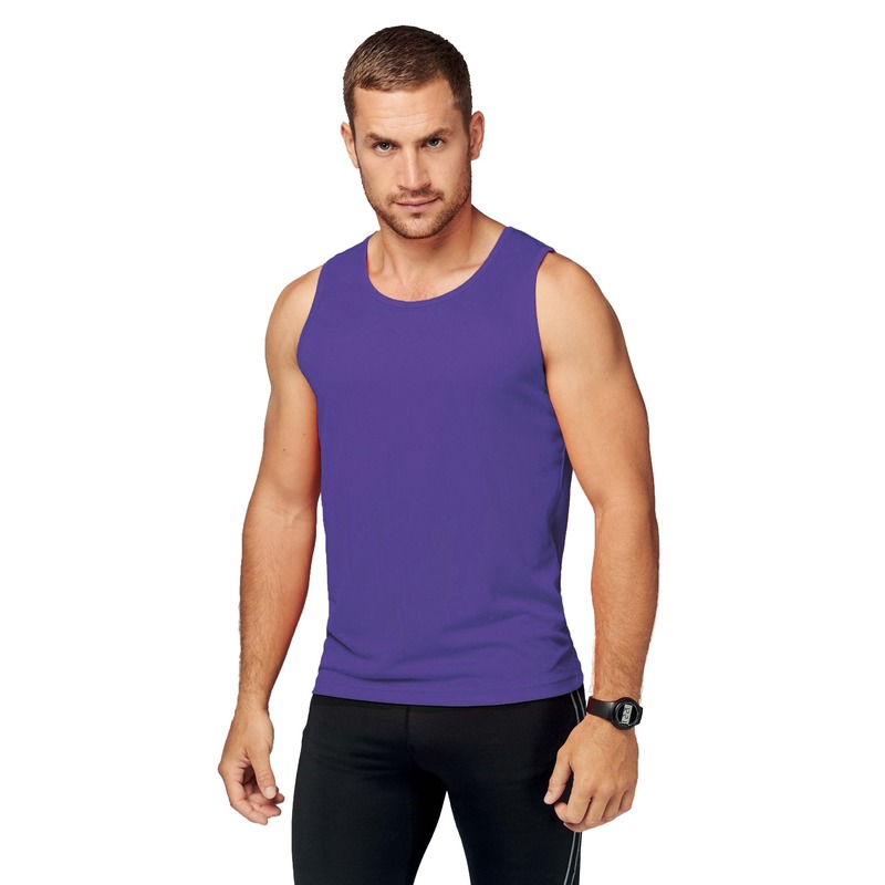 Sportief heren singlet tanktop hemd in de kleur paars. Sneldrogende stof met ventilatiegaatjes. Afgewerkte biesjes aan de halsopening en mouwinzet voor meer comfort. Een ideaal sport shirt of gewoon voor casual gebruik.