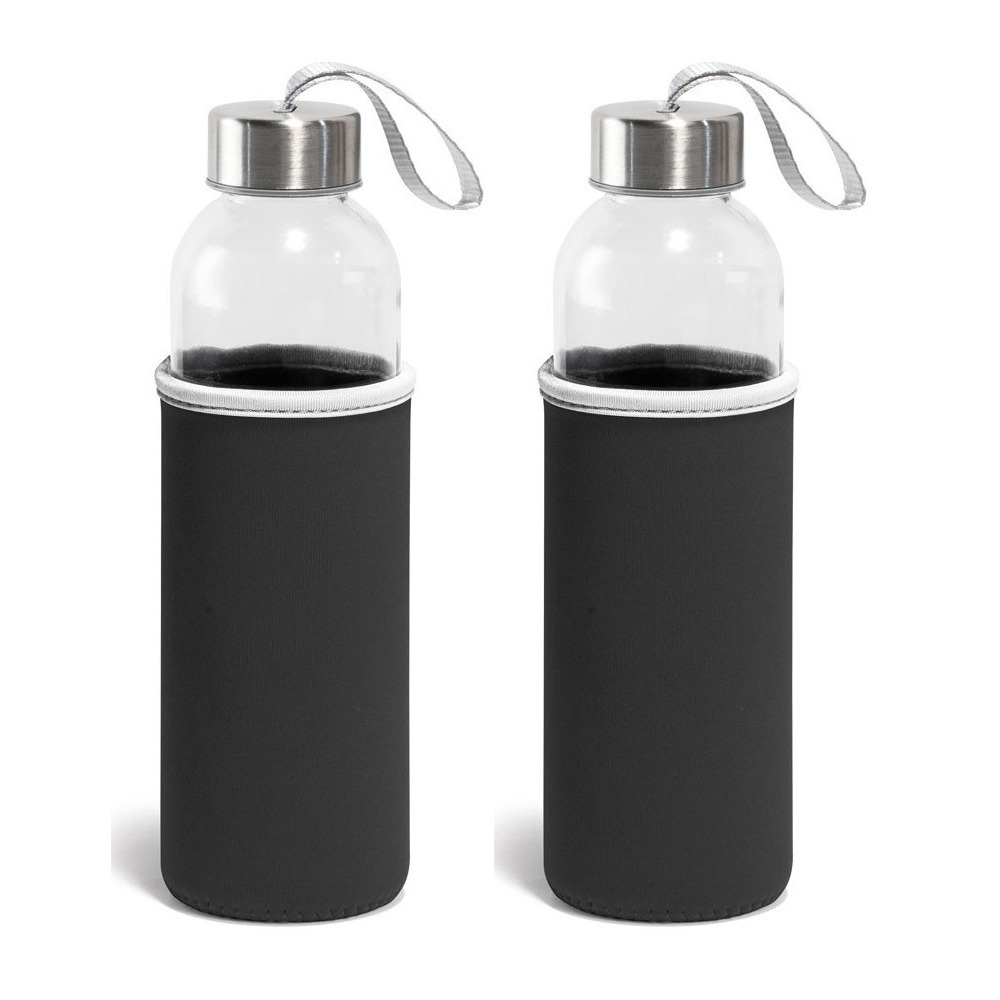 2x glazen waterfles/drinkfles met softshell hoes in de kleur zwart en RVS schroefdop met handvat. Afmeting: ca. D6,5 x H22,5 cm. Inhoud: ca. 520 ml, 52 cl. Materiaal: verhard glas. BPA-vrij: ja. Geschikt voor magnetron: ja. Geschikt voor vaatwasser: ja, de dop niet. Geschikt voor vriezer: ja. De hoes is wasmachine geschikt.
