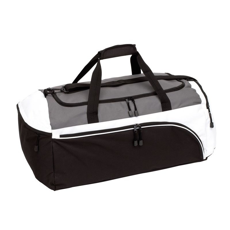 Grote zwart/witte sporttas/reistas van 63 liter inhoud. Handige sporttas/weekendtas met handvatten en verstelbare schouderband. De tas heeft diverse afsluitbare vakken. Materiaal: polyester. Formaat: ca. 72 x 34 x 26 cm. Sporttassen/weekendtassen/reistassen.