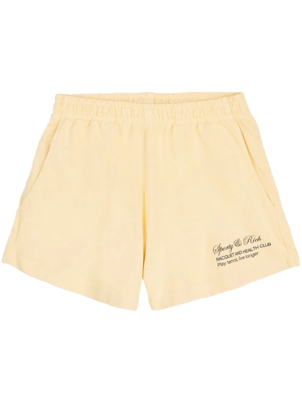 Jaune beurre, coton, ourlet à logo imprimé, ceinture élastique, poches latérales fendues, poche arrière plaquée.