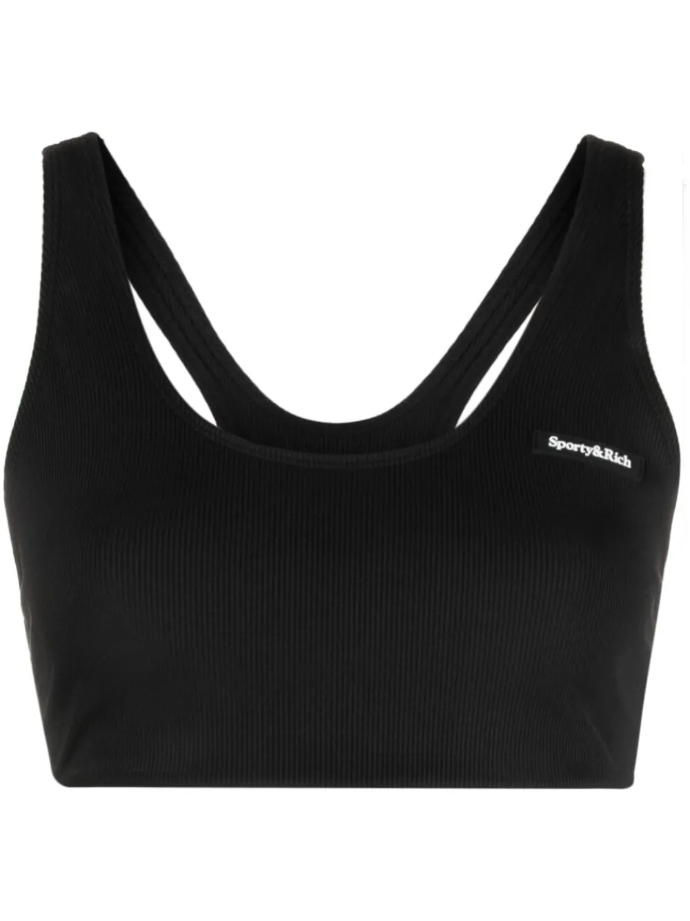 Noir, maille nervurée, patch logo sur le devant, coupe courte, encolure arrondie, dos nageur, design sans manches, ourlet droit.