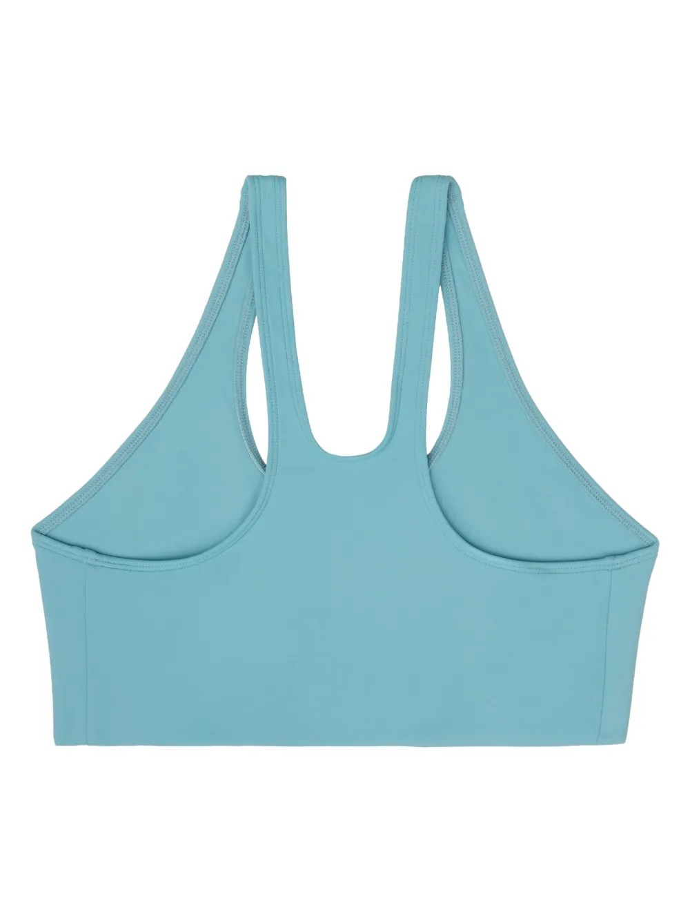 Aqua blauw, stretch design, zoom met logoprint, ronde hals, dunne bandjes, mouwloos, racerback, naadloos en cropped.