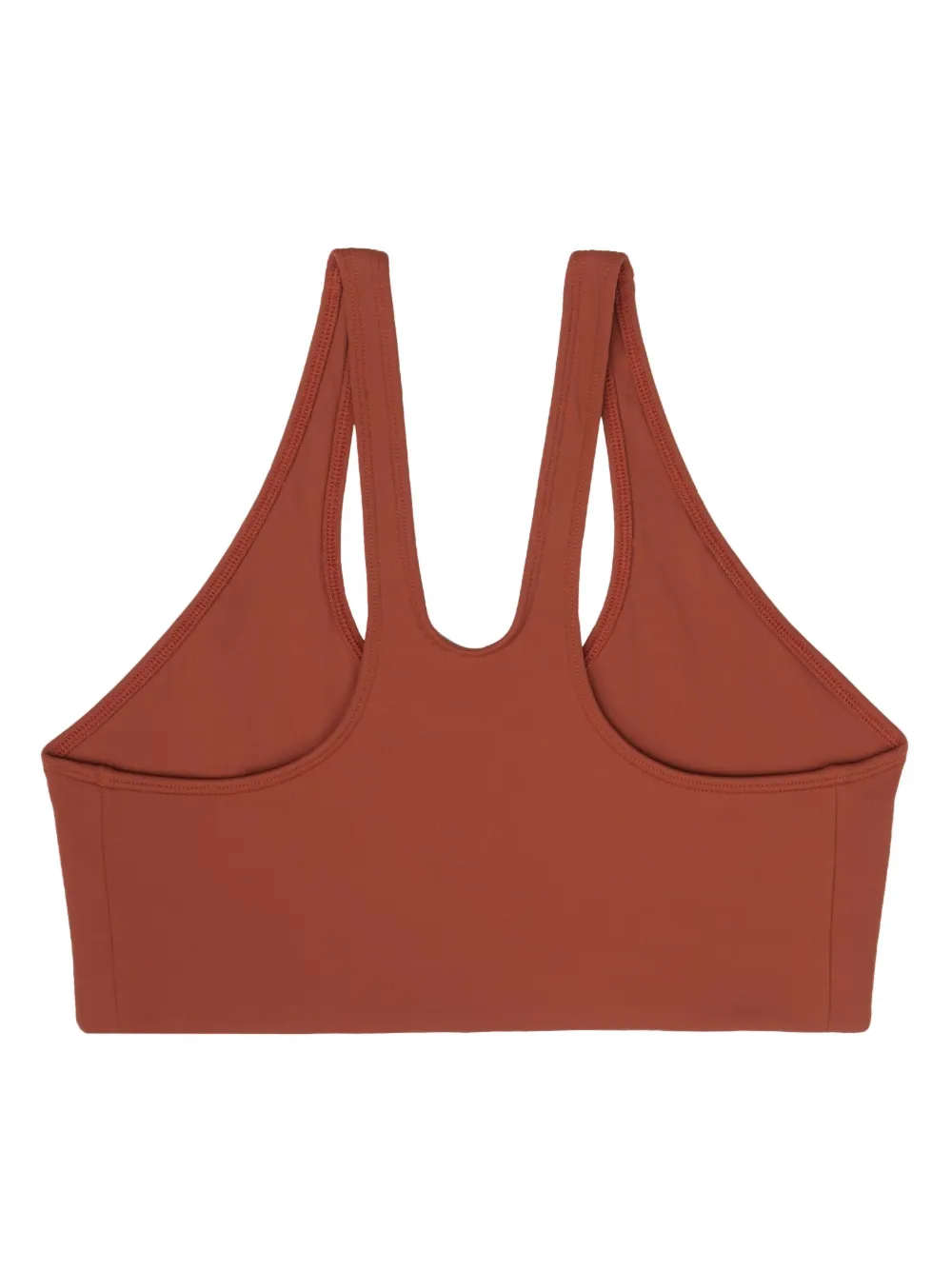 Baksteenrood, stretch design, logoprint op de voorkant, ronde hals, mouwloos en rechte zoom.