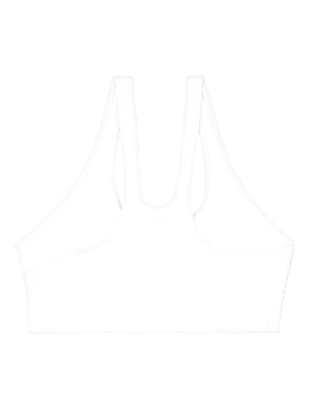 Wit, stretch design, logoprint op de voorkant, ronde hals, mouwloos en cropped.