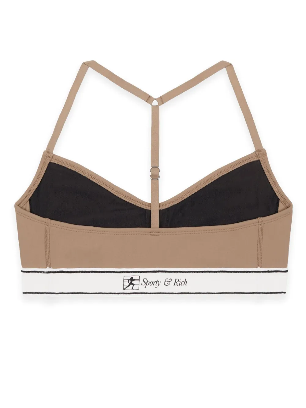 bruin/grijs stretch design band met logo diepe ronde hals verstelbare schouderbandjes T-rug