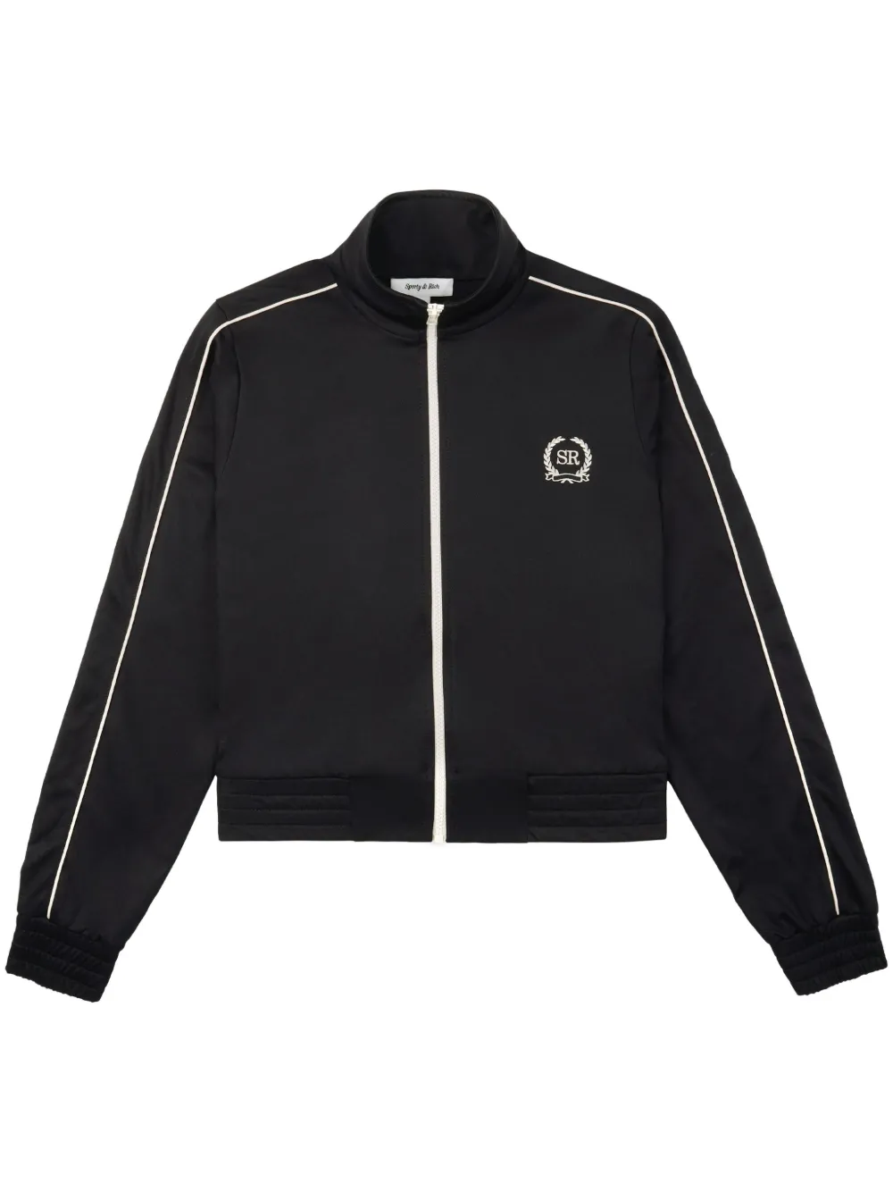 noir/blanc crème détails rayés logo brodé sur la poitrine col montant fermeture zippée devant manches longues ourlet et bords nervurés
