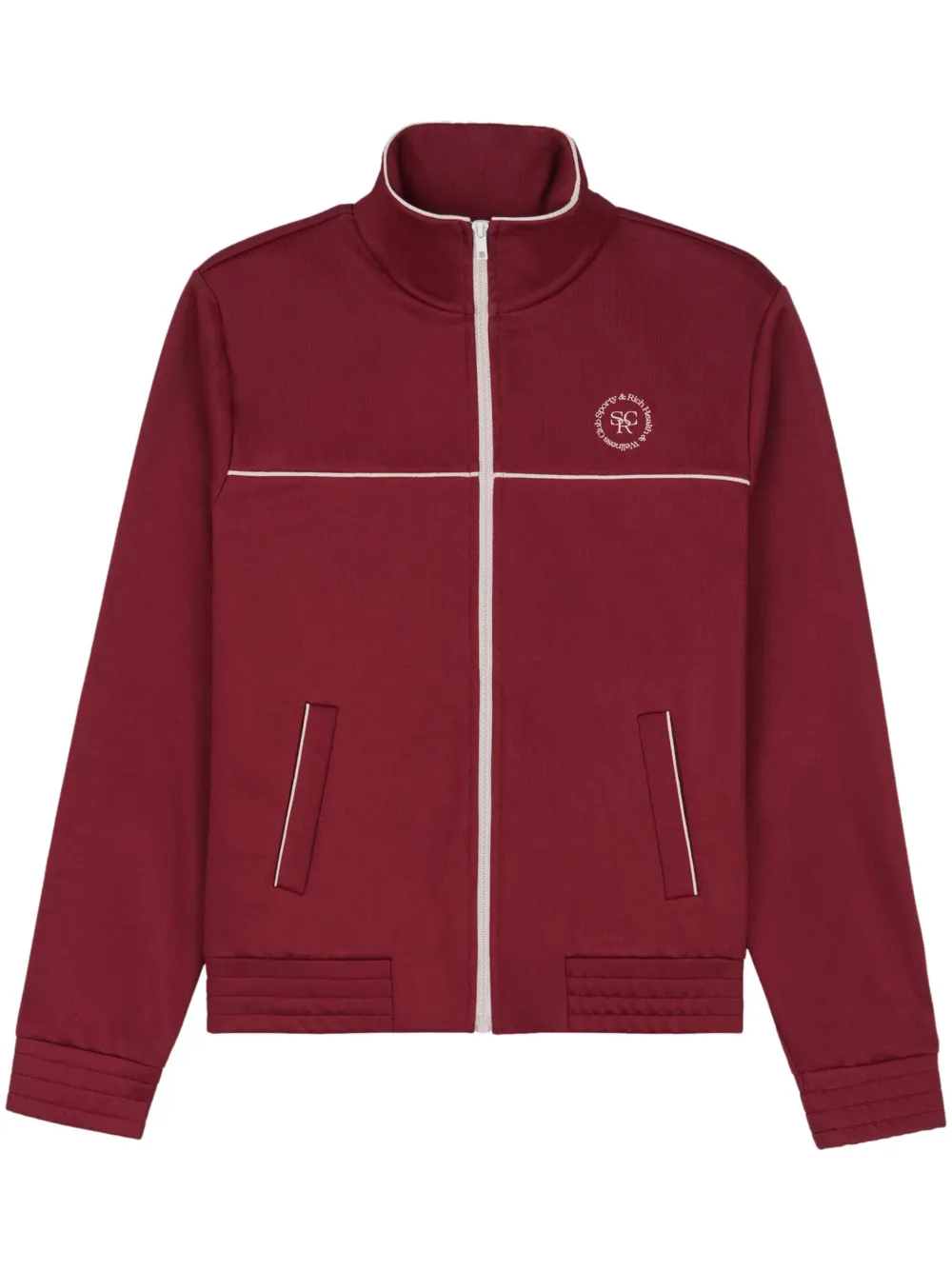 Bordeaux, coton mélangé, logo imprimé à la poitrine, col montant, fermeture zippée devant, manches longues, poignets élastiqués, deux poches passepoilées latérales, ceinture élastique.