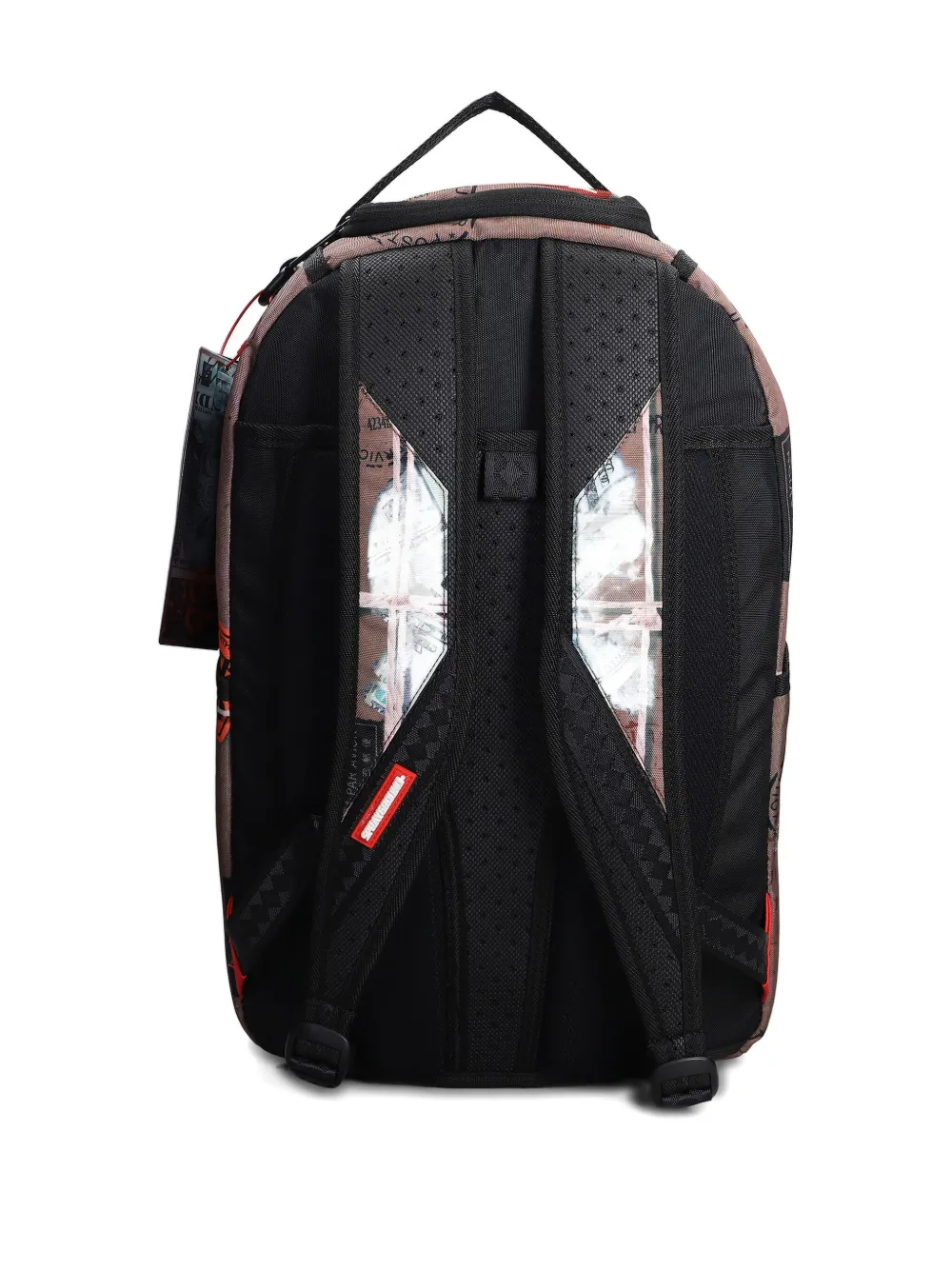 veelkleurig grafisch dollarbiljet design postzegel details ritszak aan voorkant verstelbare schouderbandjes handvat aan de bovenkant
