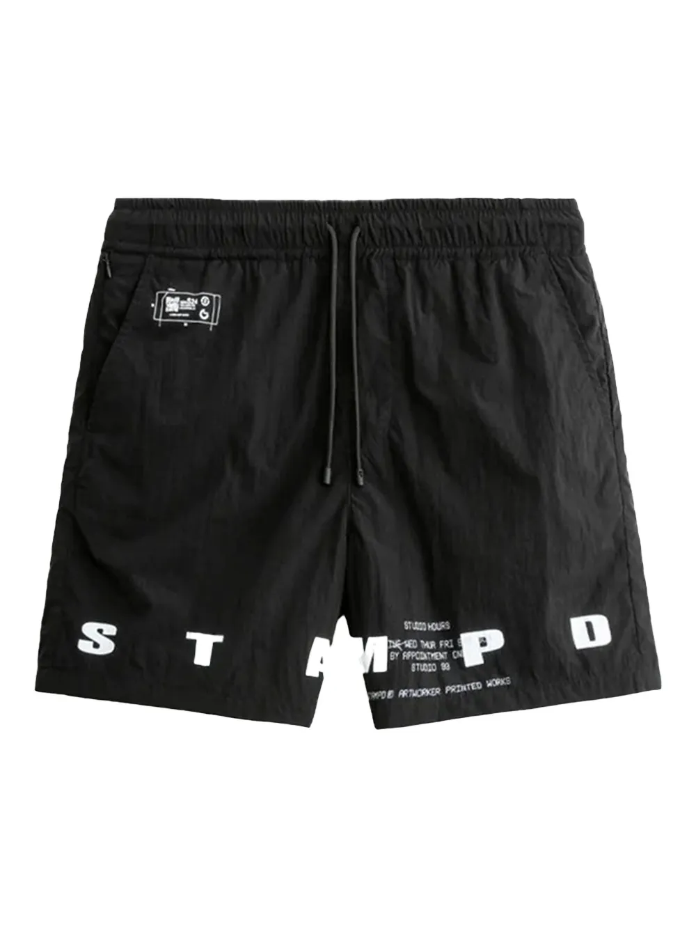 noir taille élastique à lien de resserrage poches latérales fendues imprimé graphique devant logo imprimé sur le devant imprimé texte poche arrière à rabat mini étiquette logo logo imprimé à l’arrière imprimé graphique à l’arrière coupe courte