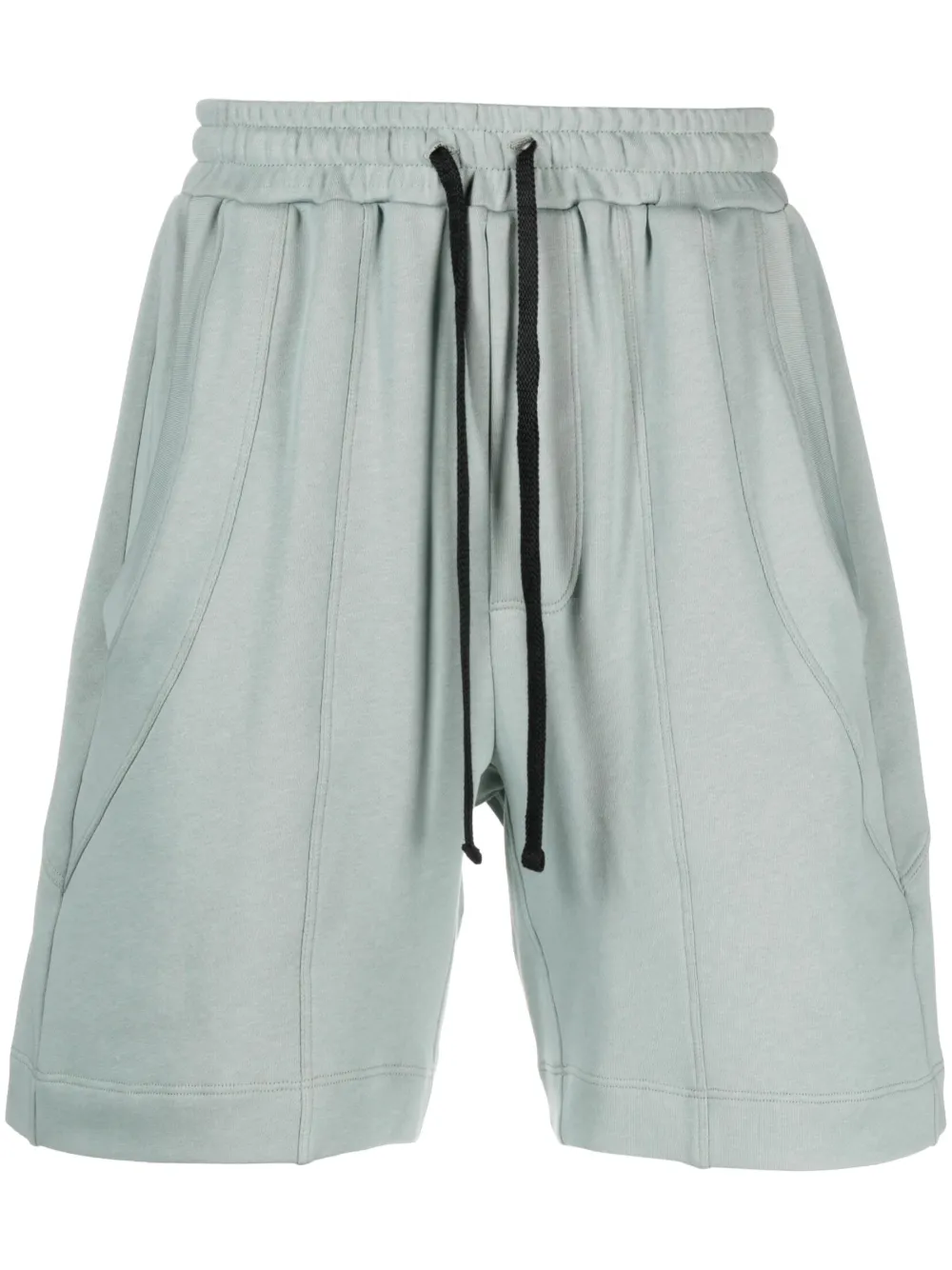 Gris-bleu, coton biologique, taille élastique à lien de resserrage, poches latérales fendues, poche arrière passepoilée, longueur au dessus du genou. .