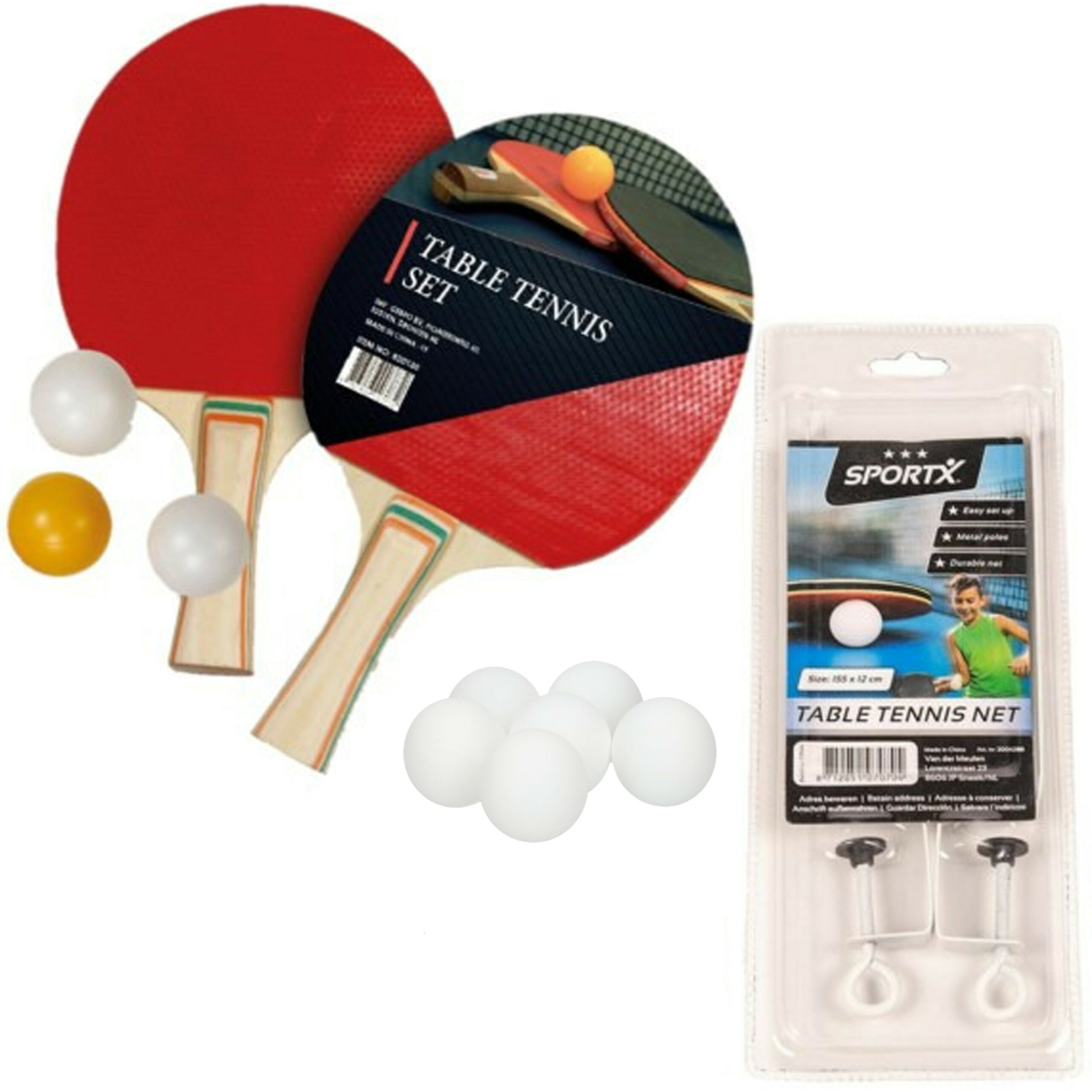Tafeltennis of ping pong setje van 2 batjes, een tafel netje en 9x tafeltennisballetjes. Formaat batjes: ca. 25 x 15 x 2 cm. Ping Pong netje met twee klemschroeven en metalen staanders. Zo maak je van elke huis of kantoor tafel gemakkelijk een tafeltennistafel! Formaat net: 155 x 12 cm. , Dit artikel bestaat uit:, 1x SportX Tafeltennis netje – voor elke tafel – inclusief bevestigingsmateriaal – pingpong, 1x Tafeltennis ballen – 6x st – 40 mm – ping pong balletjes – pingpongballen, 1x Tafeltennis set – 2 houten batjes – standaard formaat – ca 25x15x2 cm – hout/plastic – pingpongset