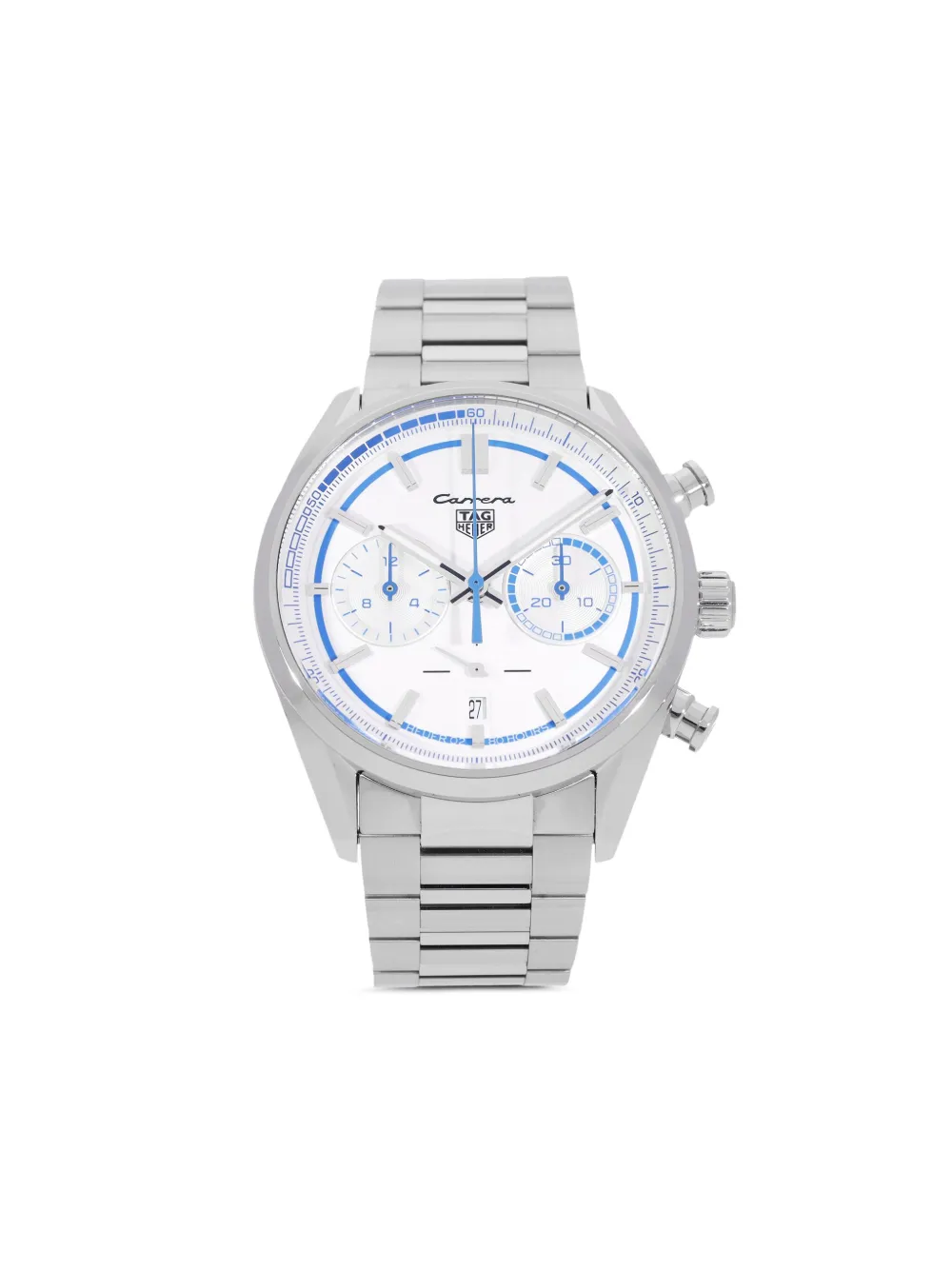 2022 pre-owned 42 mm blanc/bleu acier inoxydable boîtier rond verre saphir cadran géométrique aiguilles bâton indicateur de date compteurs de chronographe mouvement automatique double bouton poussoir couronne vissée bracelet ajustable boucle déployante Cet article sera livré dans sa boîte d’origine et accompagné de ses documents et certificat CHRONEXT. L’authenticité de cet article est garantie par des horlogers CHRONEX. La garantie CHRONEXT couvre pendant deux ans tout dommage occasionné par l’eau sur les montres étanches et toute réparation du mouvement.