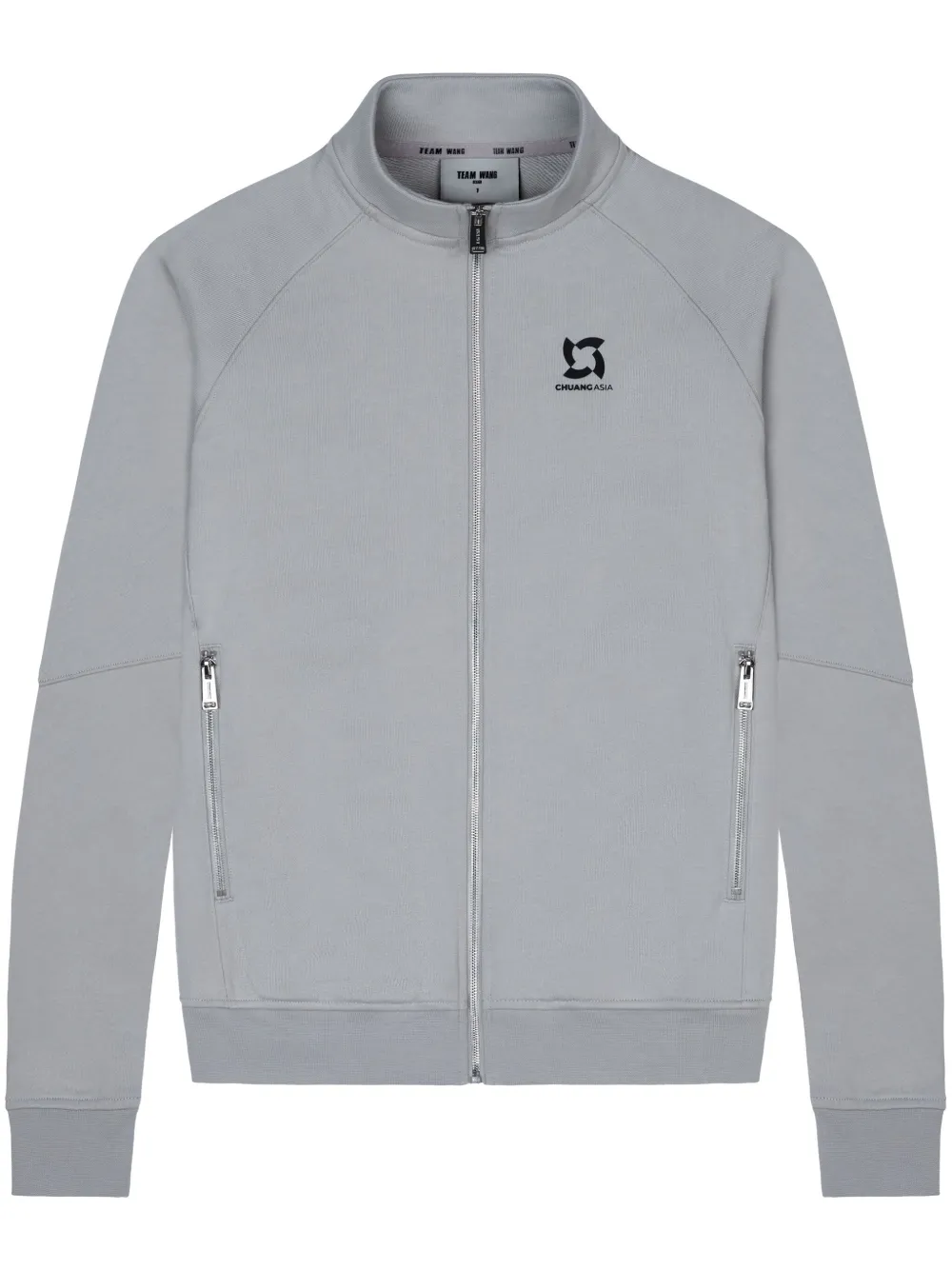 gris coton logo imprimé à la poitrine col montant fermeture zippée devant manches longues poches à fermeture zippée devant ourlet droit