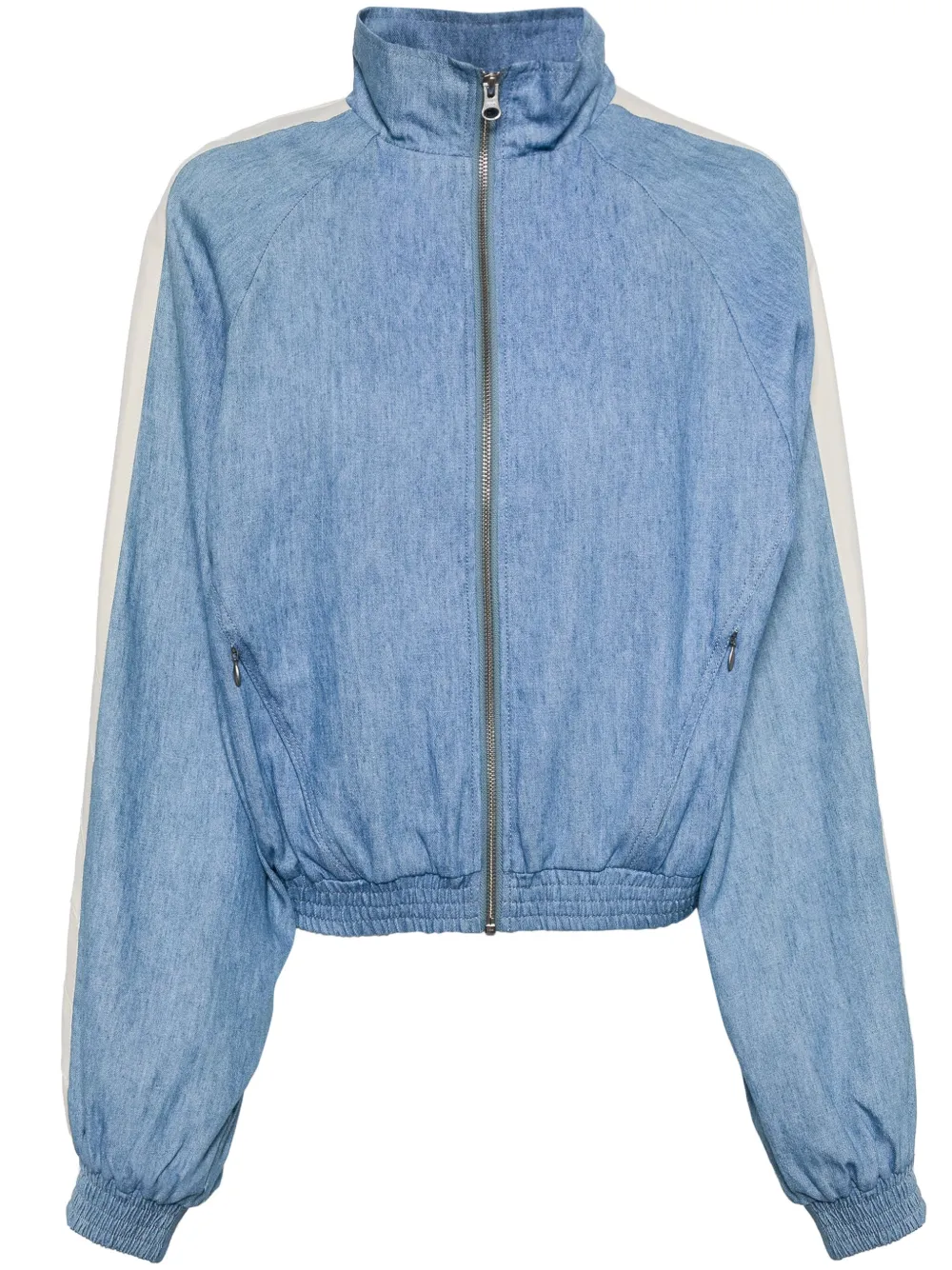 bleu ciel polyester recyclé mélangé fermeture zippée devant deux poches latérales zippées bordure rayée logo brodé à l’arrière col montant poignets élastiqués ourlet élastiqué ^