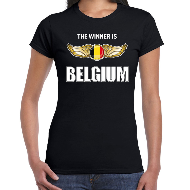 The winner is Belgium t-shirt zwart voor dames. Op dit zwarte Belgie landen shirt staat: The winner is Belgium. Het t-shirt met gouden vleugels is leuk om cadeau te geven of om als supporter te dragen tijdens bijvoorbeeld het songfestival, de olympische spelen of het EK voetbal. Fan / supporter kleding.