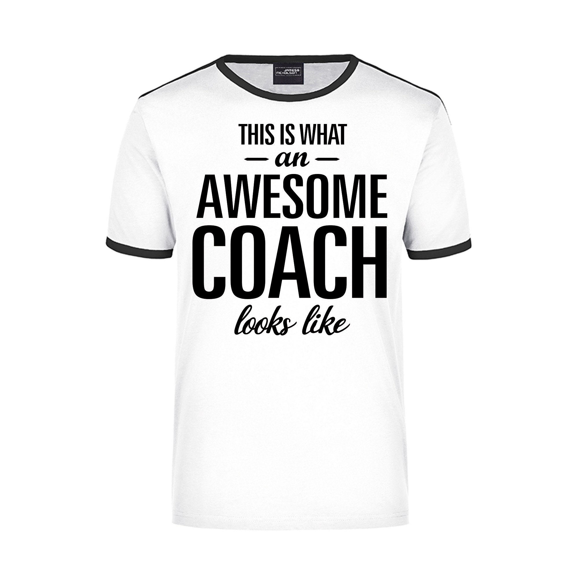 This is what an awesome coach looks like / Dit is hoe een geweldige coach eruit ziet wit/zwart ringer t-shirt voor heren. Op dit witte shirt met zwarte strepen staat de tekst: This is what an awesome coach looks like. Het t-shirt is leuk om kado te doen aan het eind van het sport seizoen, of natuurlijk een andere gelegenheid. Materiaal: 160 grams, 100% katoen.
