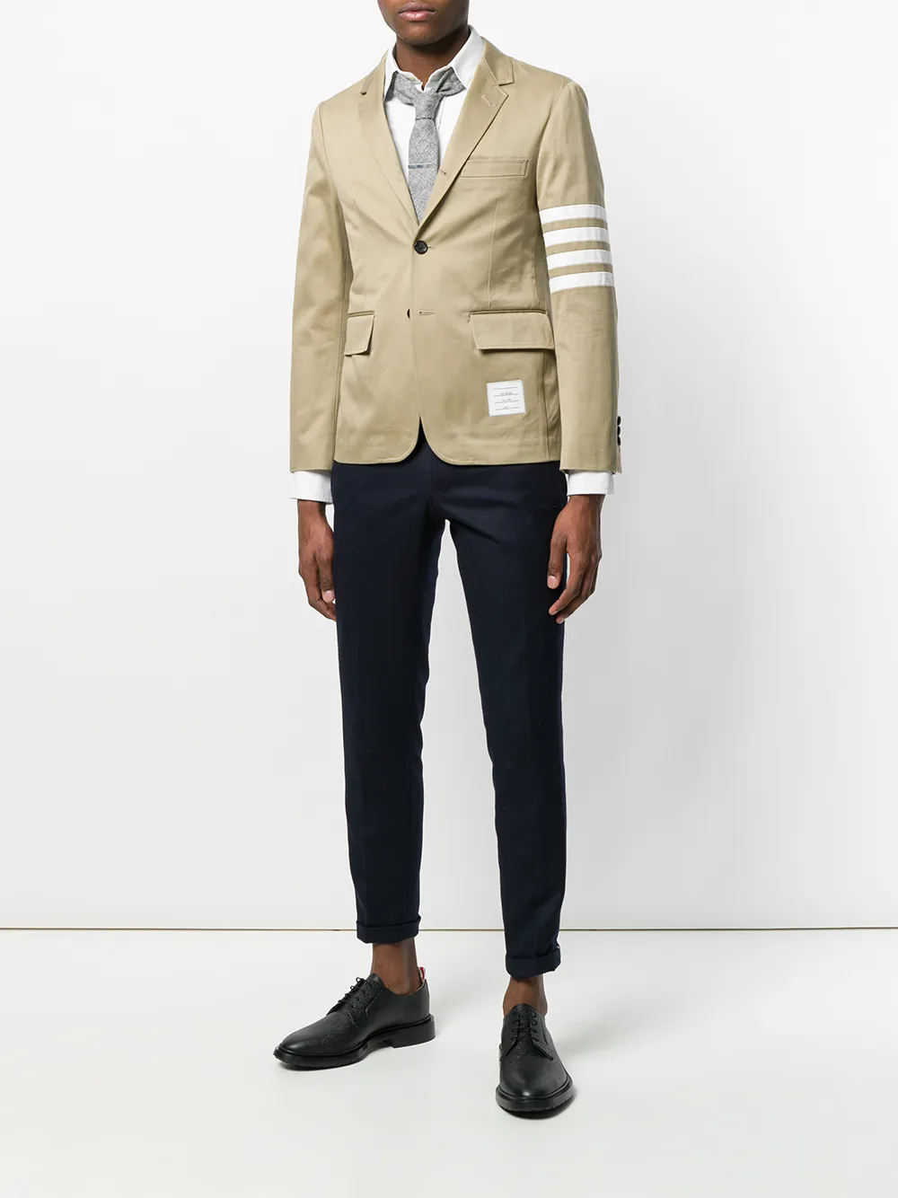 Classic Unconstructed 4-Bar Stripe Sport Coat van Thom Browne uitgevoerd in katoen voorzien van slim fit, gekartelde revers, knoopsluiting aan de voorzijde, borstzak, zijflapzakken, ingekorte mouwen, knoopmanchetten, kenmerkende driekleurige strepen, dubbele split aan de achterzijde en gedeeltelijk gevoerd.