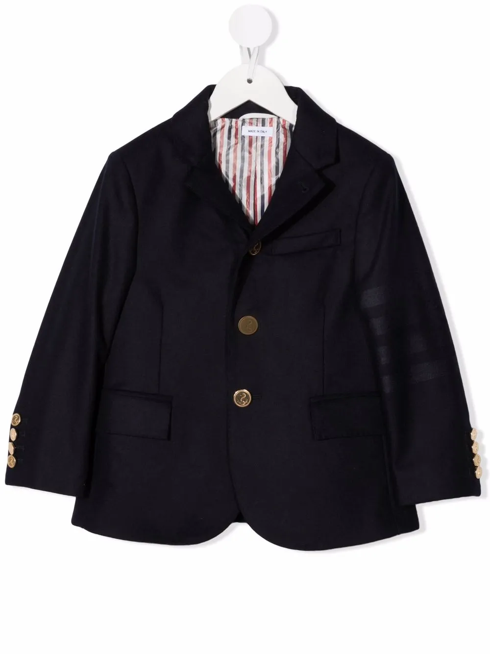 Rayures bleu, blanc et rouge, revers crantés, boutonnière sur le devant, manches longues, poignets boutonnés, poches devant à rabat, ourlet incurvé.