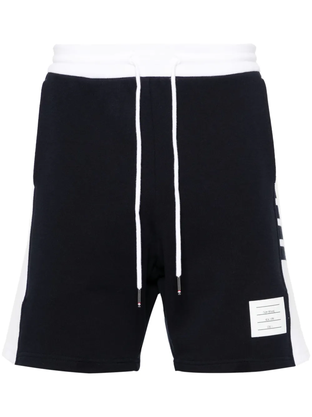bleu/blanc coton texture jersey design colour block patch logo sur le côté 4 bandes signature languette signature en gros-grain taille mi-haute taille élastique à lien de resserrage deux poches latérales passepoilées coupe droite coupe courte