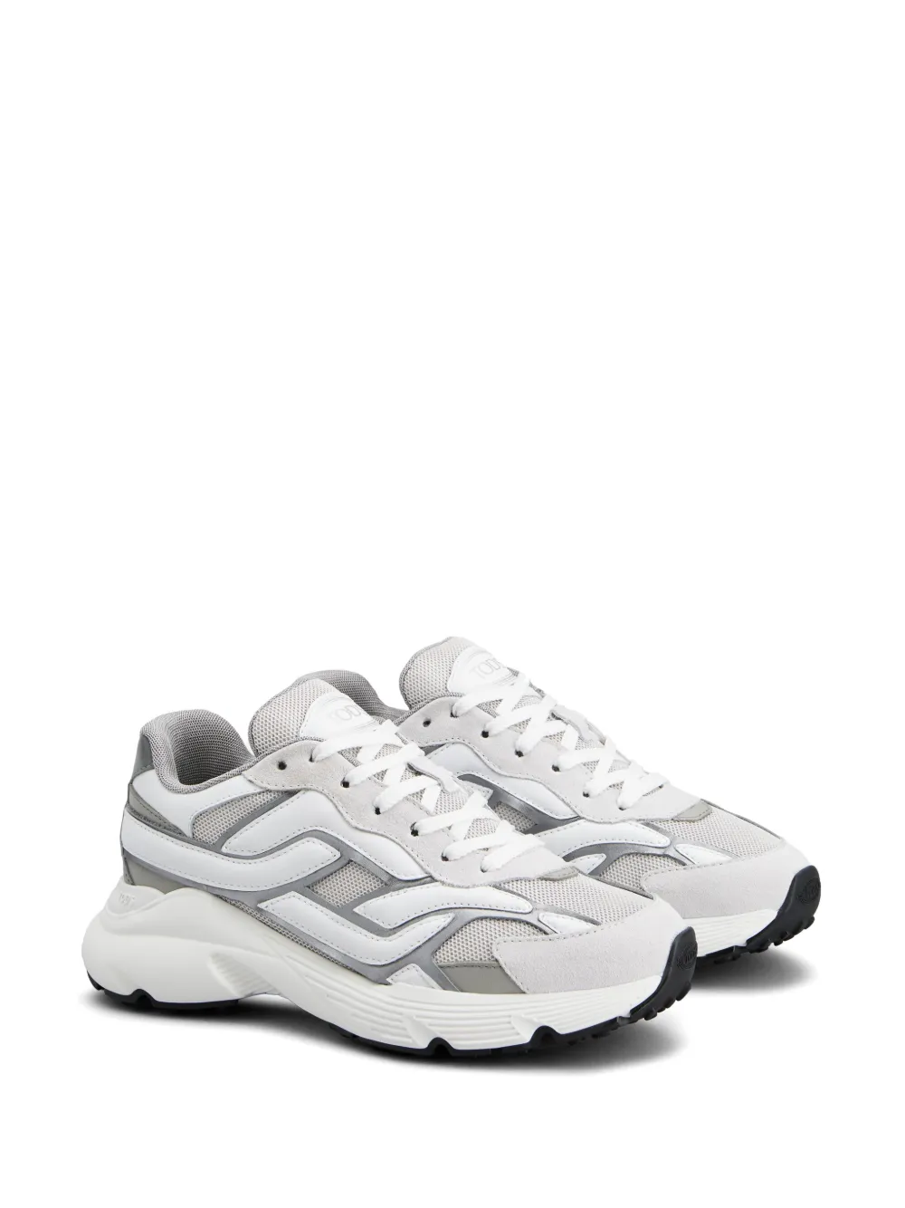 wit/heather grijs canvas/kalfsleer vlakken met colourblocking suède vlakken mesh vlak metallic effect logopatch veters aan voorkant chunky rubberen zool