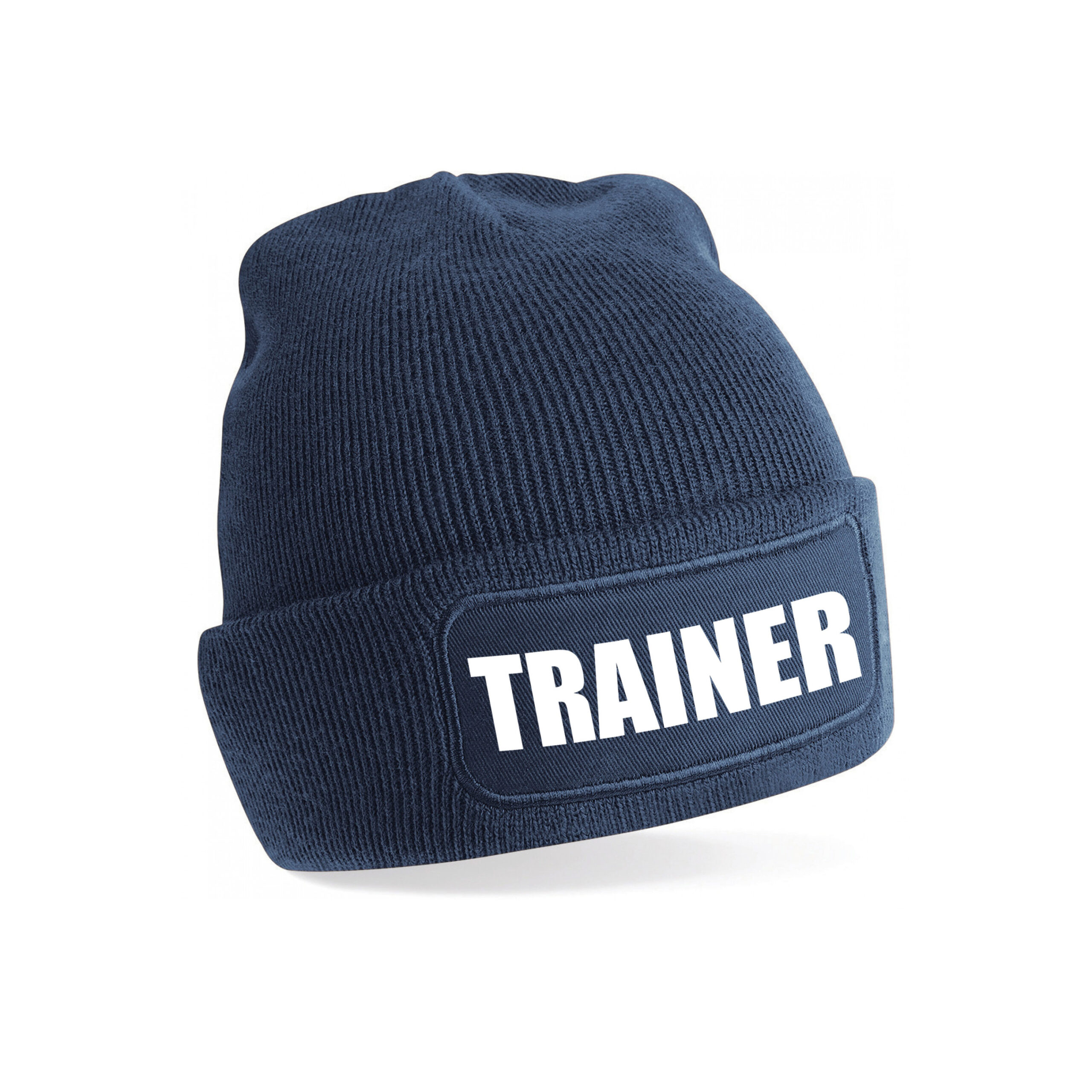 Muts voor volwassenen in de kleur navy met de tekst: Trainer. Leuke muts voor de koude dagen of gewoon om te dragen tijdens bijvoorbeeld een wedstrijd of met wintersport. Ook een leuk cadeau om aan je trainer te geven aan het einde van het sportseizoen. De muts is gemaakt van 100% acryl. One size fits all. Merk: Bellatio Decorations.