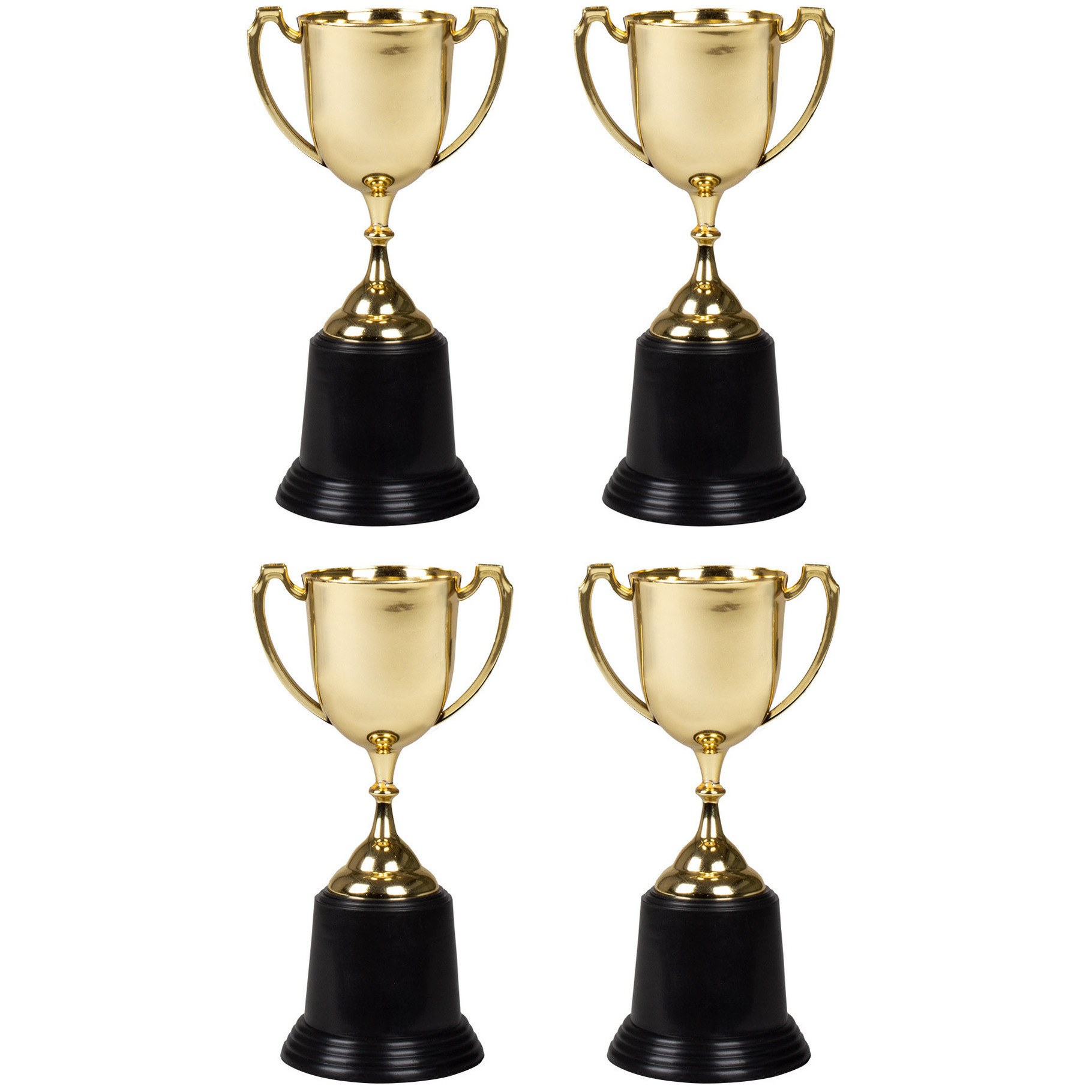 4x trofee / prijsbeker met handvaten in de kleur goud. De cup/beker is ca. 22 cm hoog, de breedte inclusief handvaten is ca. 9 cm. De trofee heeft geen tekst of afslag, maar heeft wel ruimte op het voetstuk om bijvoorbeeld zelf een sticker op te plakken. Materiaal: kunststof.