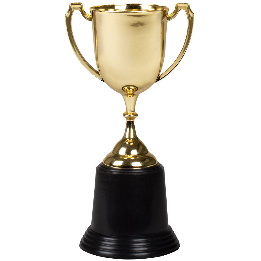 Trofee / prijsbeker met handvaten in de kleur goud. De cup/beker is ca. 22 cm hoog, de breedte inclusief handvaten is ca. 9 cm. De trofee heeft geen tekst of afslag, maar heeft wel ruimte op het voetstuk om bijvoorbeeld zelf een sticker op te plakken. Materiaal: kunststof.