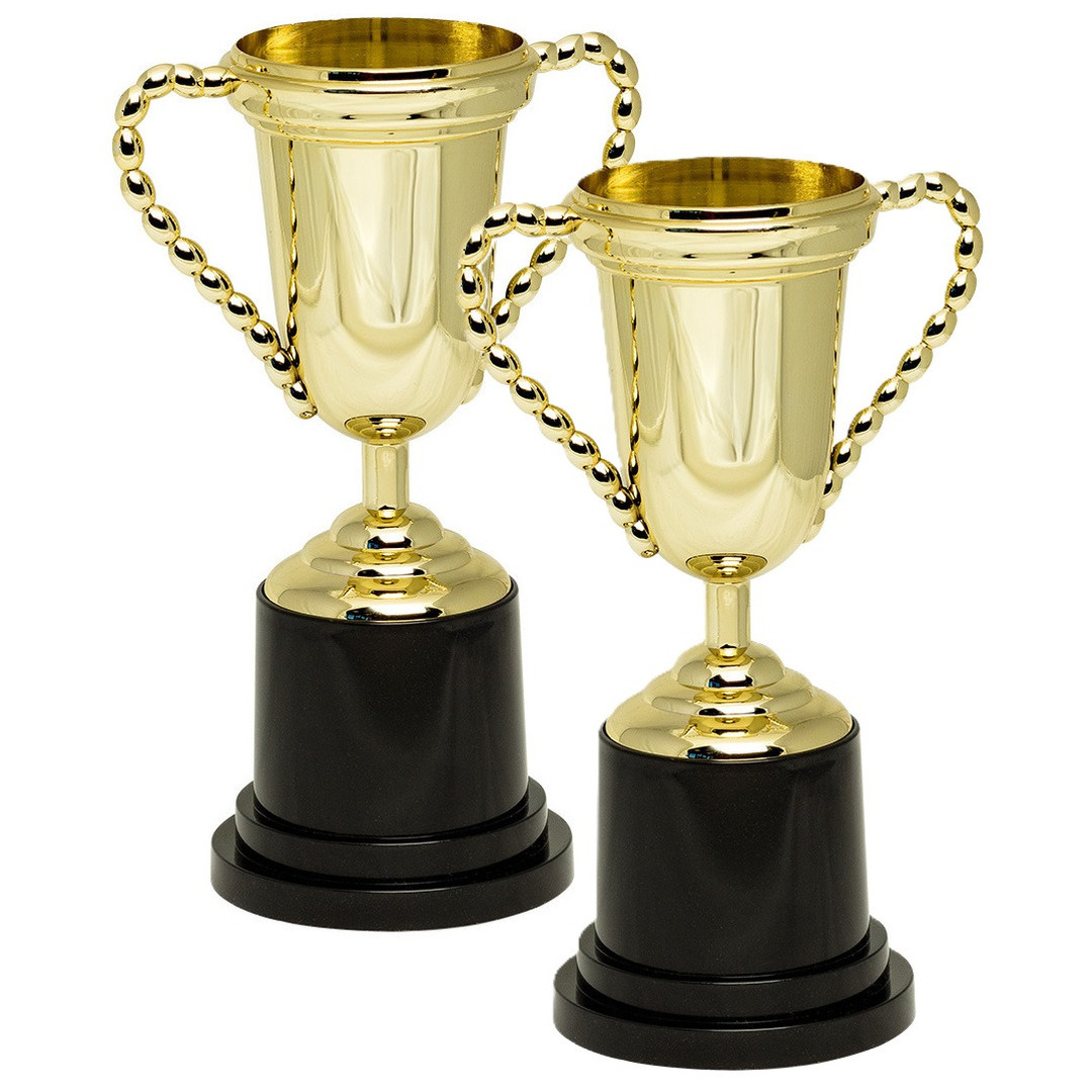 2x trofee / prijsbeker met grote oren, in de kleur goud. De cup/beker is circa 25 cm hoog en circa 11 cm breed. De trofee heeft geen tekst of afslag, maar heeft wel ruimte op het voetstuk om hier bijvoorbeeld zelf een sticker op te plakken. Materiaal: kunststof.
