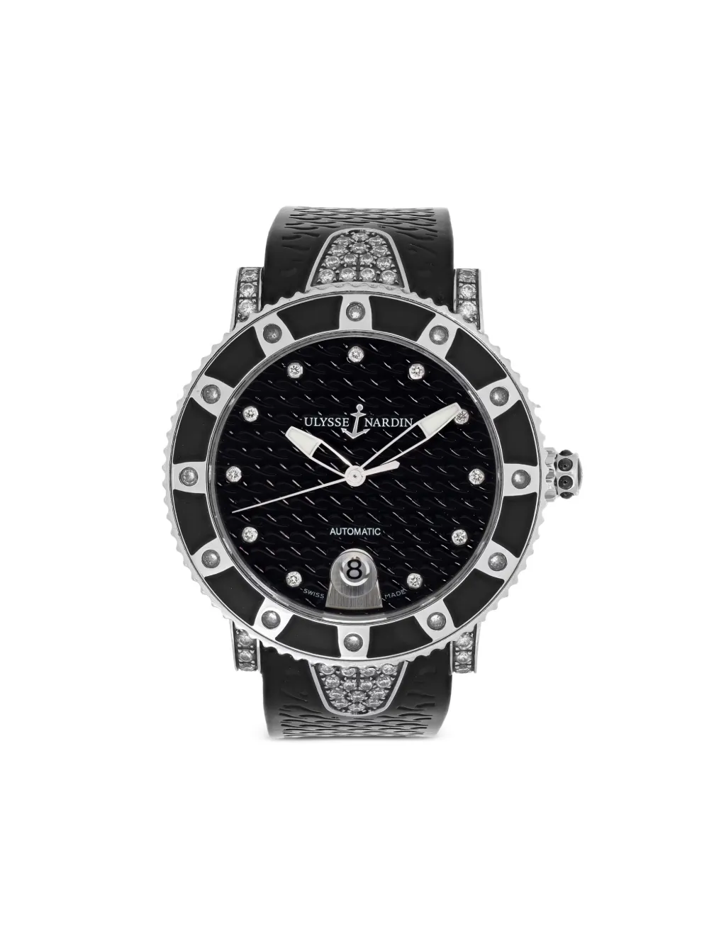 40 mm noir acier inoxydable boîtier rond cadran orné de diamants aiguilles bâton indicateur de date mouvement automatique couronne vissée lunette incrustée de diamants Cet article bénéficie d’un an de garantie standard proposé par la boutique partenaire. Boîte d’origine incluse.Documents originaux non inclus. État : EXCELLENT. Cet article pre-owned est dans un état presque parfait et ne présente aucun signe d’usure.