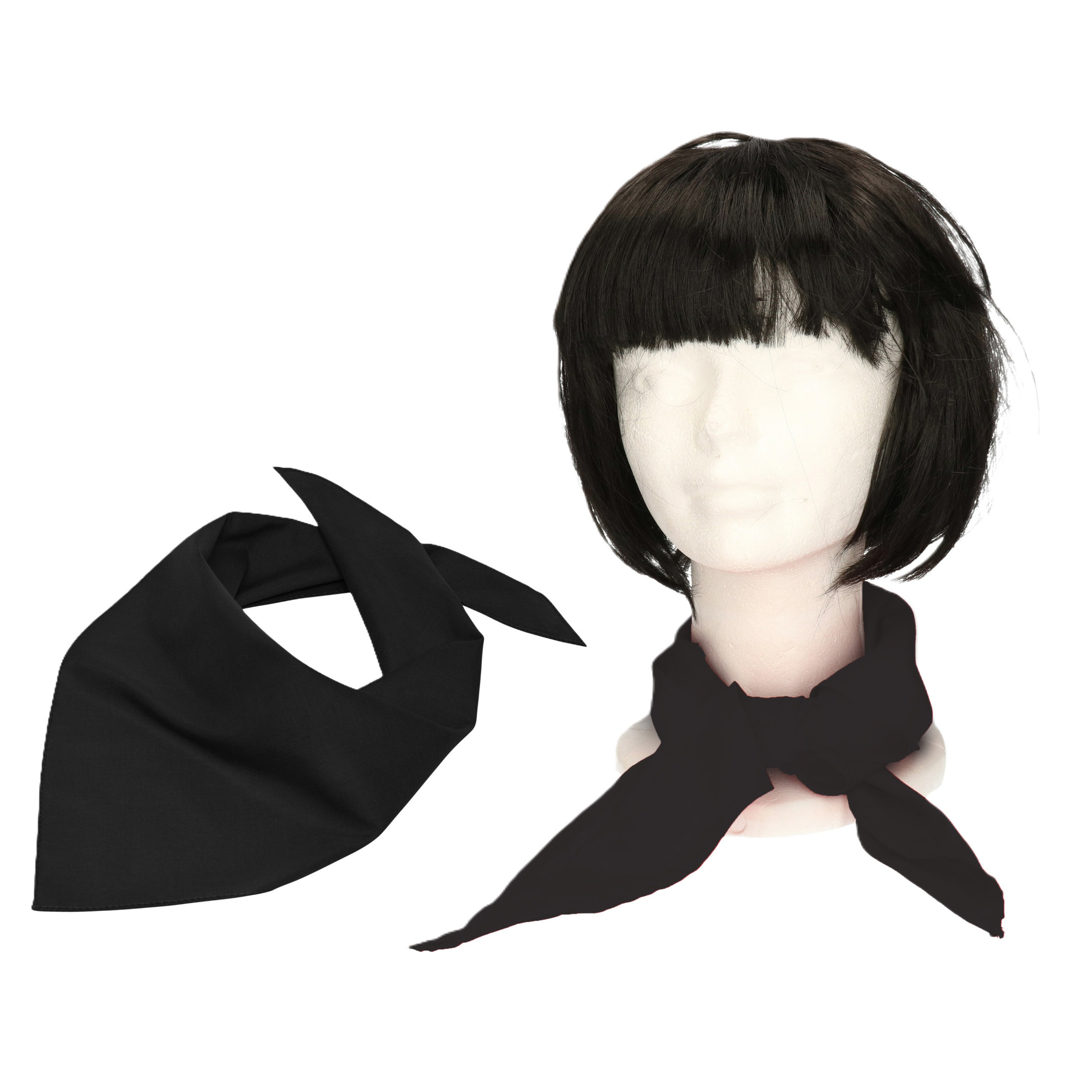 2x bandana/zakdoek verkleed sjaaltje zwart voor volwassenen. Multifunctionele verkleed bandana/sjaaltje geschikt voor ieder verkleed thema. Handig om verschillende kleuren teams mee te maken bij sport en spel, of gewoon om je carnaval outfit mee af te stylen. Te dragen als sjaaltje om je net, of als hoofddoekje/bandana. Afmeting: 84 x 40 cm (driehoek). Materiaal: 97% polyester, 3% katoen. Kwaliteit: 17 grams. Merk: Myrtle Beach.