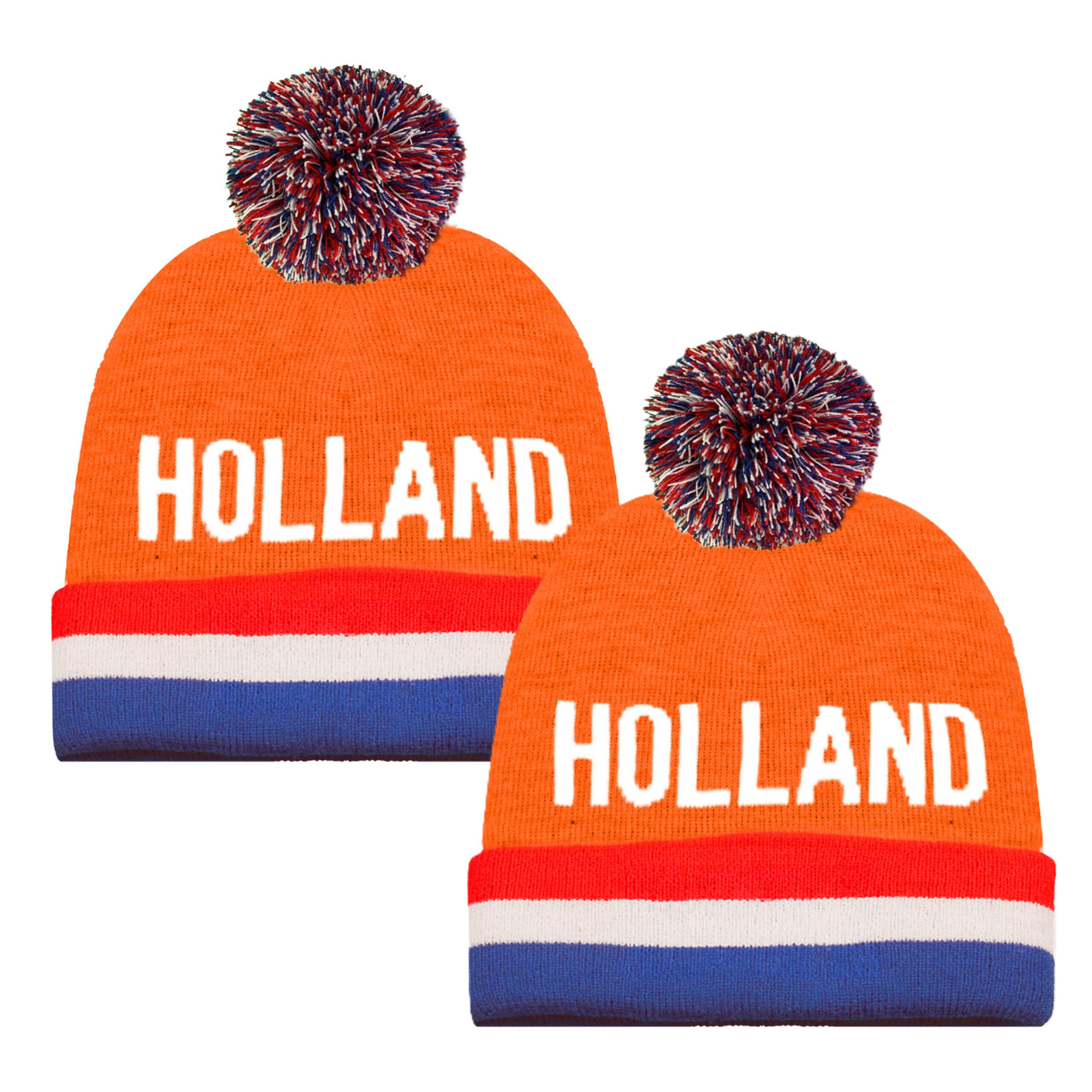 2x verkleed muts in landen vlag kleuren voor de echte supporters van Nederland/holland. Deze muts is geschikt voor volwassenen en grote kinderen. Materiaal: 100% polyester. Fans en supporters kleding voor sport events. Muts met leuke pompom bovenop en tekst.