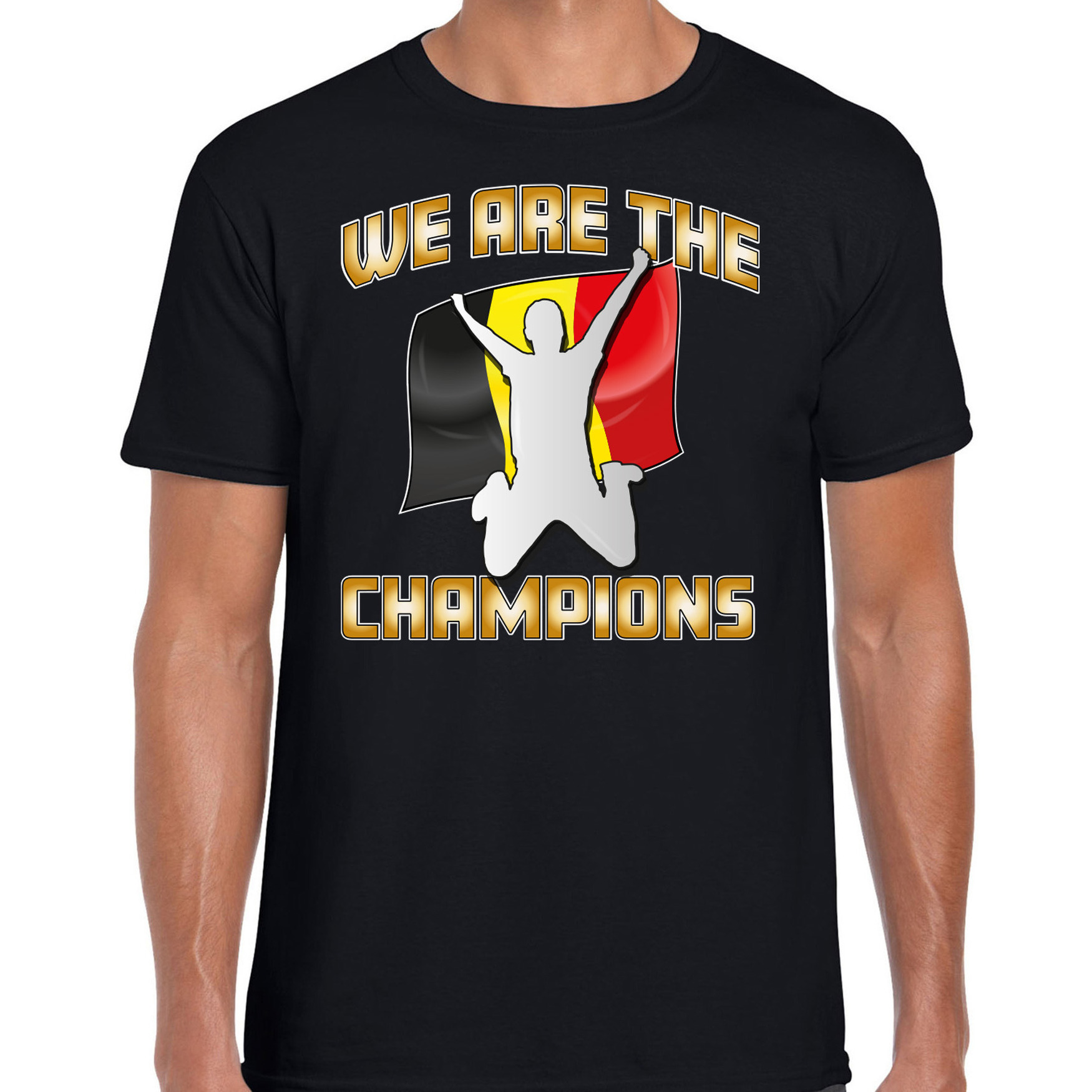 Verkleed T-shirt voor heren in de kleur zwart. Het shirt is bedrukt met de tekst: We are the champions! Met de vlag van Belgie. Heb je binnenkort een voetbal wedstrijd of een ander sport evenement waarbij je Belgie wil aanmoedigen? Dan is dit bedrukte T-shirt de perfecte keuze! Support Belgie met dit leuke bedrukte shirt. Ook leuk om te dragen naar een themafeestje of gewoon zomaar. Materiaal: 145 grams, 100% katoen. Merk: Bellatio Decorations.