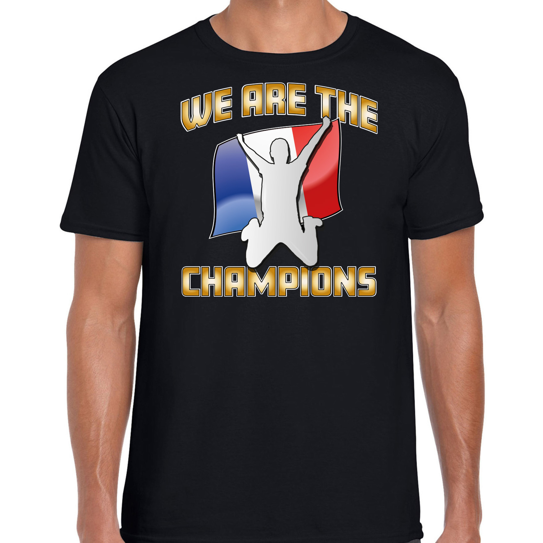 Verkleed T-shirt voor heren in de kleur zwart. Het shirt is bedrukt met de tekst: We are the champions! Met de vlag van Frankrijk. Heb je binnenkort een voetbal wedstrijd of een ander sport evenement waarbij je Frankrijk wil aanmoedigen? Dan is dit bedrukte T-shirt de perfecte keuze! Support Frankrijk met dit leuke bedrukte shirt. Ook leuk om te dragen naar een themafeestje of gewoon zomaar. Materiaal: 145 grams, 100% katoen. Merk: Bellatio Decorations.