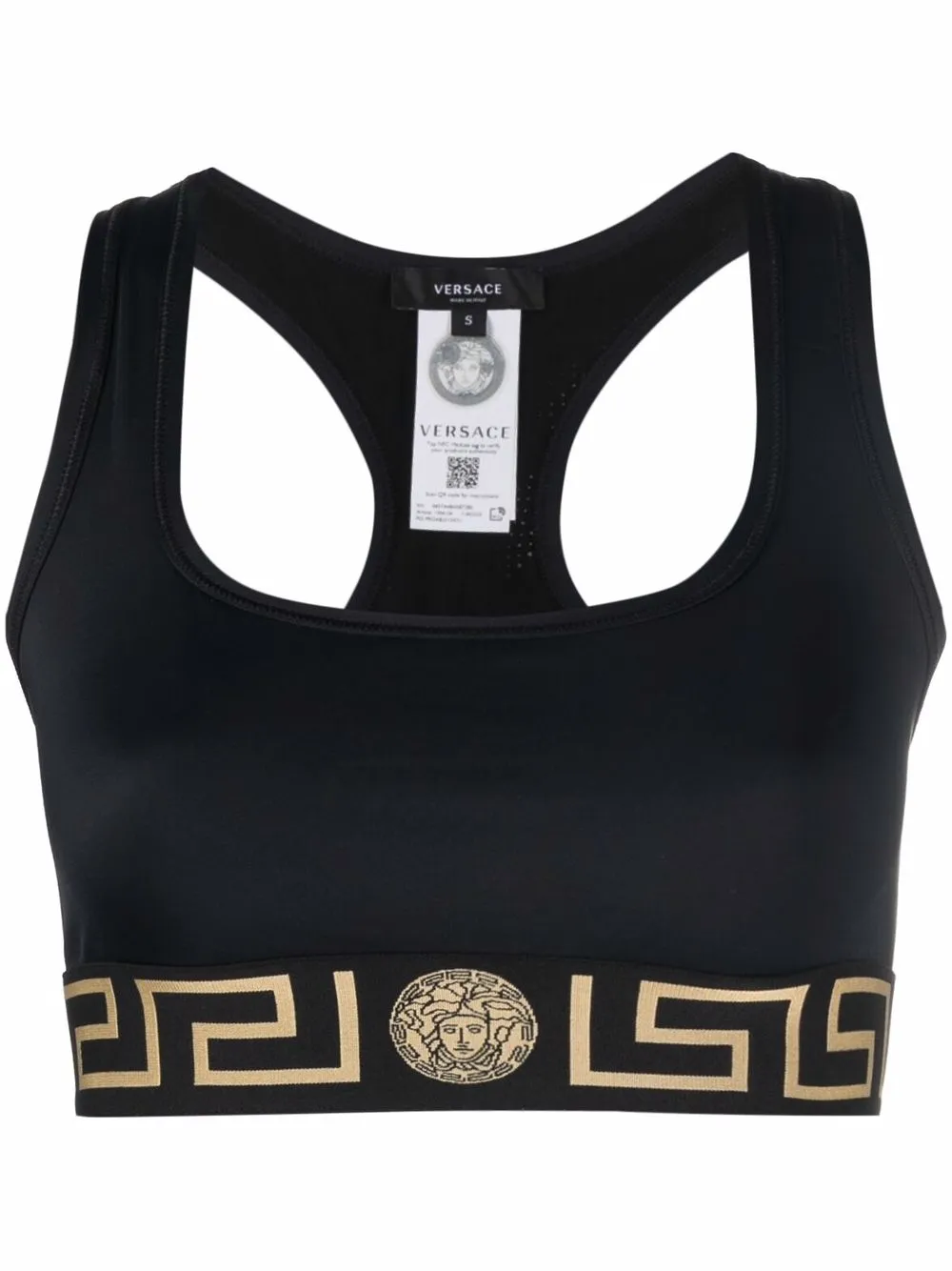 Modèle bicolore, motif Medusa, ceinture à logo, design sans manches, dos nageur, construction stretch. Couleur : noir.