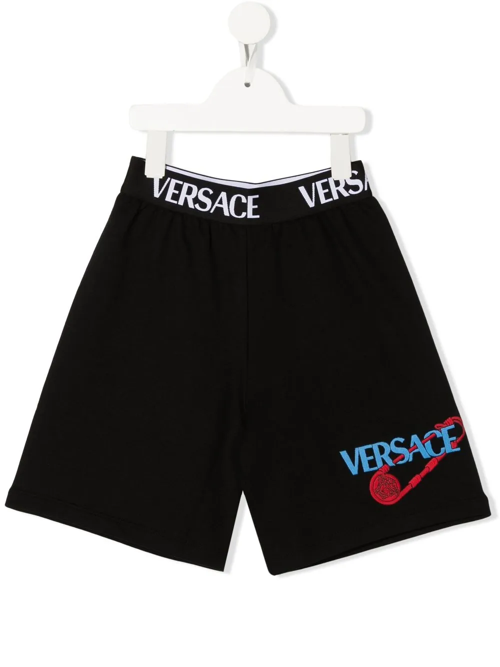 Noir, coton, logo imprimé sur la cuisse, ceinture à logo, poche arrière plaquée, ceinture élastique, coupe droite, hauteur genou.