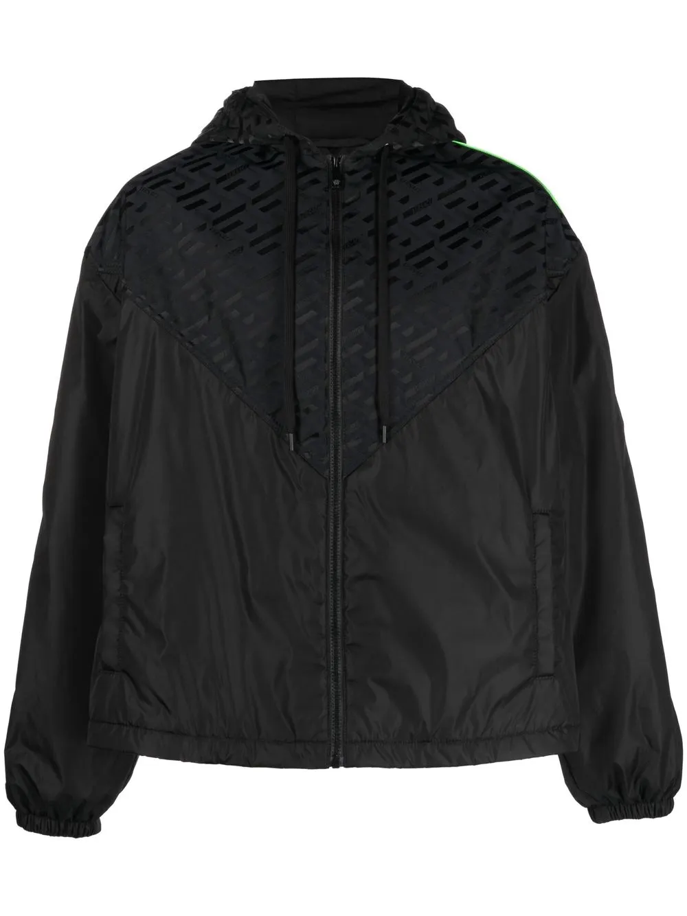 Noir, coton, motif Greca signature imprimé, design à empiècements, capuche à lien de resserrage, poignets élastiqués, deux poches latérales fendues, fermeture zippée devant.