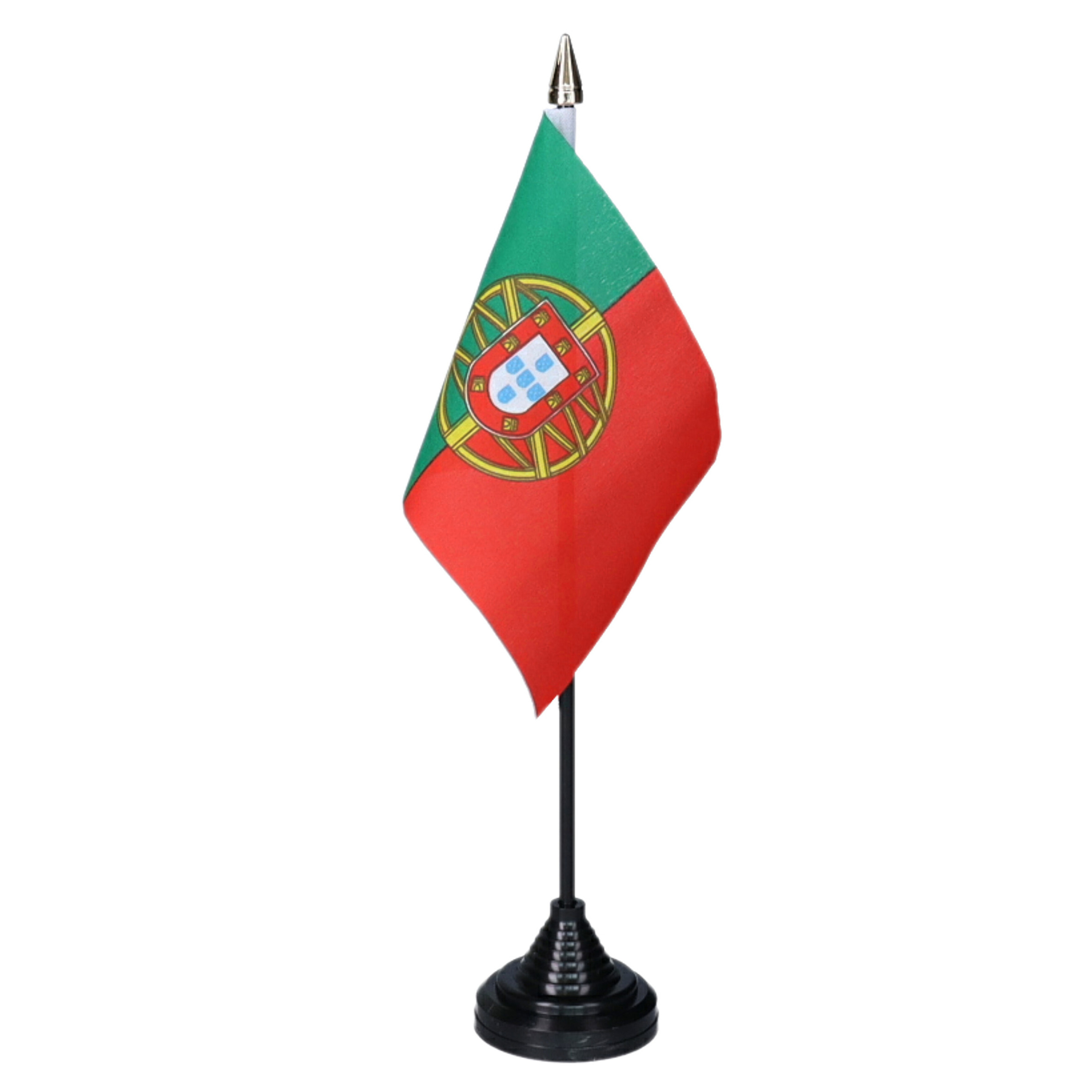 Vlag Portugal tafelvlaggetje inclusief zwarte base/standaard. Aantal: 1x. Het kleine polyester vlaggetje is ongeveer 10 x 15 cm, het kunststof stokje (inclusief vlaggetje) is ca. 27 cm lang. Het kunststof voetje is ca. 5,7 x 4 cm groot. Plaats het vlaggetje in de basis en deze blijft staan. Versieringen voor tafels en bureaus voor echte supporters. Landen thema tafel versieringen en feestartikelen van alle landen hebben wij in onze winkel. Materiaal houder: kunststof. , Dit artikel bestaat uit:, 1x Portugal – mini vlaggetje van 10 x 15 cm op stokje – Landen vlag – H27 cm, 1x Standaard voor tafelvlaggetje – zwart – kunststof – met 1 gaatje