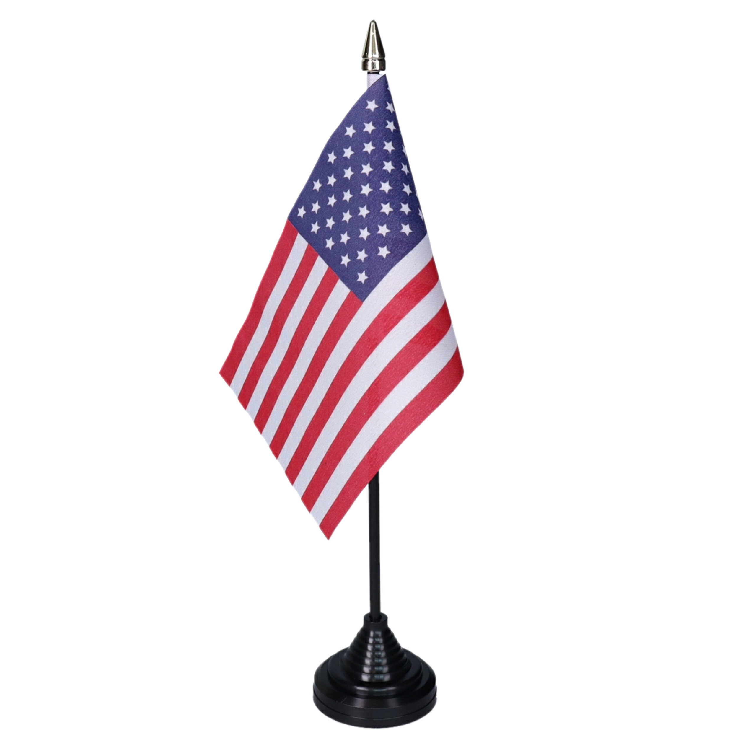 Vlag USA Amerika tafelvlaggetje inclusief zwarte base/standaard. Aantal: 1x. Het kleine polyester vlaggetje is ongeveer 10 x 15 cm, het kunststof stokje (inclusief vlaggetje) is ca. 27 cm lang. Het kunststof voetje is ca. 5,7 x 4 cm groot. Plaats het vlaggetje in de basis en deze blijft staan. Versieringen voor tafels en bureaus voor echte supporters. Landen thema versieringen en feestartikelen van alle landen hebben wij in onze winkel. Materiaal houder: kunststof. , Dit artikel bestaat uit:, 1x Amerika/USA – mini vlaggetje van 10 x 15 cm op stokje – Landen vlag – H27 cm, 1x Standaard voor tafelvlaggetje – zwart – kunststof – met 1 gaatje