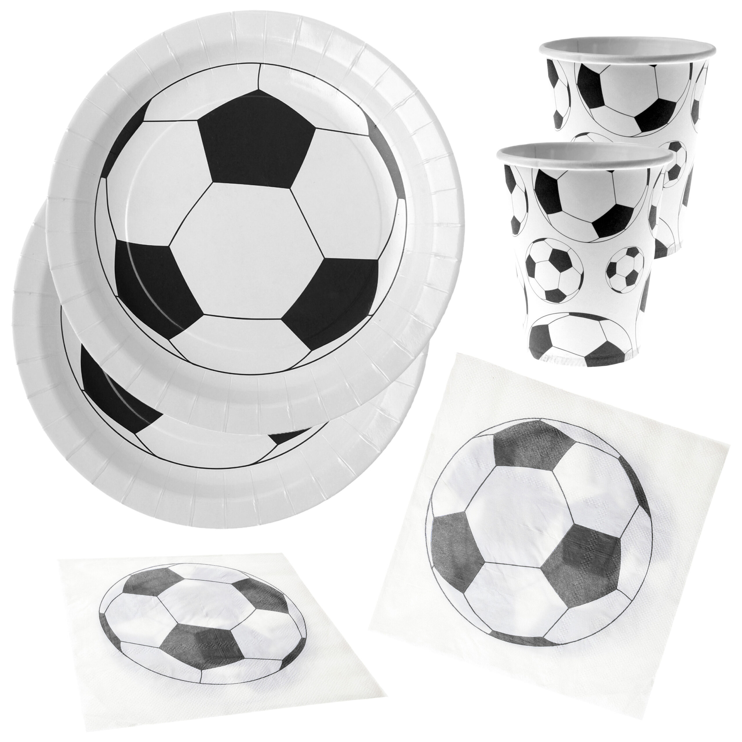 40-delig Santex voetbal thema feest pakket met wegwerp servies van karton (papier). De artikelen hebben de opdruk van voetballen en zijn in de kleur wit/zwart. Het pakket bestaat uit 20x eetbordjes/gebaksbordjes, 20x limonadebekers/drinkbekers, 20x servetten (3-laags). Deze set met party wegwerpservies is perfect voor een voetbalfeestje, verjaardag of bij het kijken van een belangrijke voetbalwedstrijd!