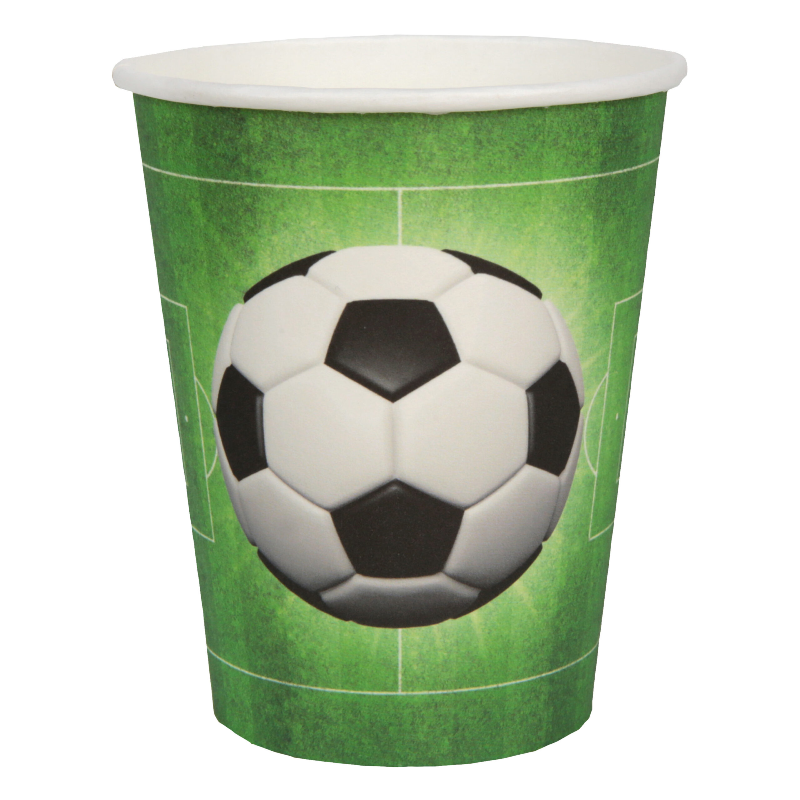 10x Santex voetbal thema feest bekertjes in de kleur groen. Wegwerp party bekertjes van stevig karton, met de opdruk van een voetbal en voetbalveld. Deze wegwerp bekers zijn perfect voor een voetbalfeestje, verjaardag of bij het kijken van een belangrijke voetbalwedstrijd!