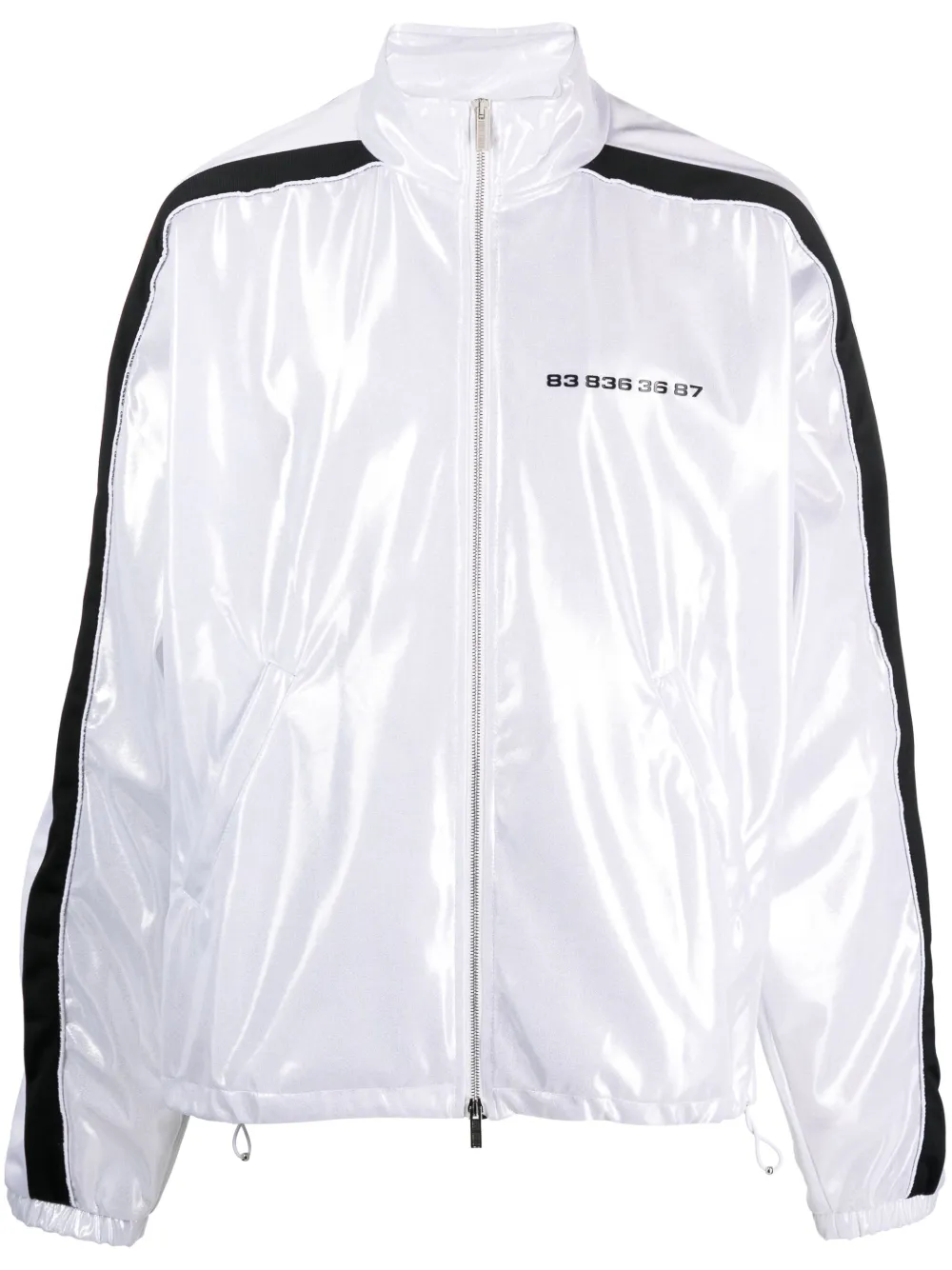 Argenté, chiffre imprimé sur le devant, détail de rayure latérale, fermeture zippée à double sens sur le devant, deux poches passepoilées latérales, manches longues, poignets élastiqués, ourlet à lien de resserrage.