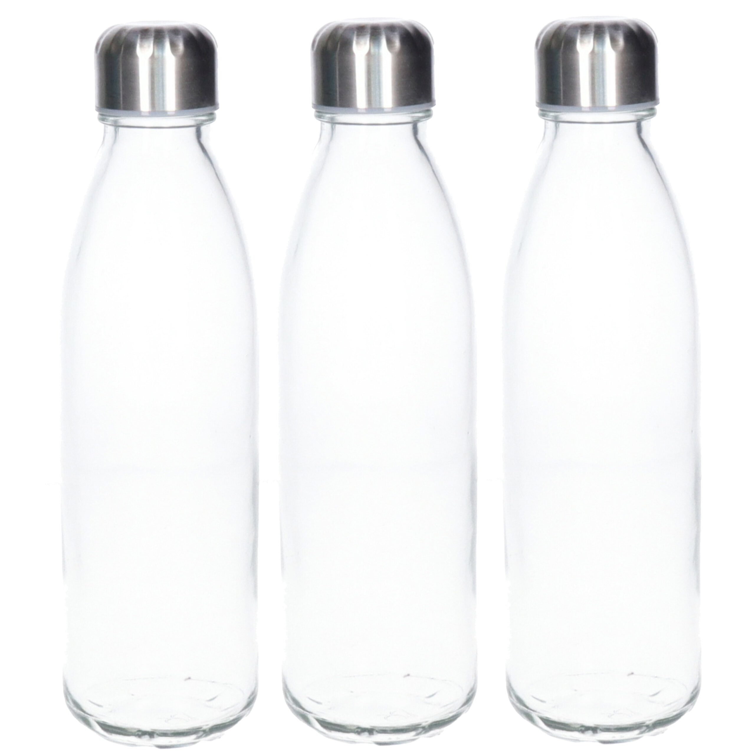 3 Stuks glazen waterfles/drinkfles/sport bidon in het transparant met RVS dop. Afmeting: ca. D7 x H26 cm. Inhoud: ca. 650 ml, 65 cl. Gewicht: ca. 370 gram. Materiaal fles: verhard glas. BPA-vrij: ja. Geschikt voor magnetron: nee. Geschikt voor vaatwasser: ja, de dop niet. Geschikt voor vriezer: ja. Wordt geleverd in een kartonnen doosje.