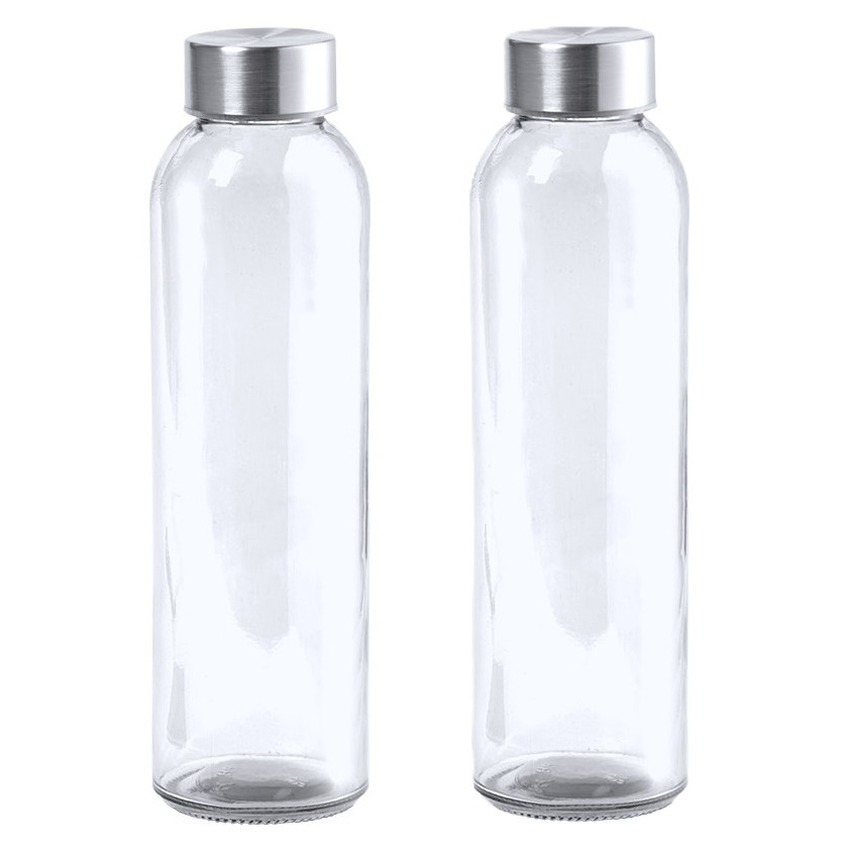2x glazen waterfles/drinkfles AQUAMAN, in de kleur transparant, met RVS dop en inhoud van 500 ml. Afmeting: ca. D6,5 x H22 cm. Inhoud: ca. 500 ml, 55 cl. Gewicht: ca. 250 gram. Materiaal fles: verhard glas. BPA-vrij: ja. Geschikt voor magnetron: nee. Geschikt voor vaatwasser: ja, de dop niet. Geschikt voor vriezer: nee. Wordt geleverd in een kartonnen doosje.