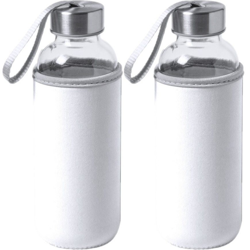 2x glazen waterfles/drinkfles bidon met softshell stof hoes in het wit met handvat en RVS schroefdop. Afmeting: ca. D6,5 x H19 cm. Inhoud: ca. 420 ml, 42 cl. Gewicht: 238 gram. Materiaal: verhard glas. BPA-vrij: ja. Geschikt voor magnetron: nee. Geschikt voor vaatwasser: ja, de dop niet. Geschikt voor vriezer: ja. De hoes is wasmachine geschikt.
