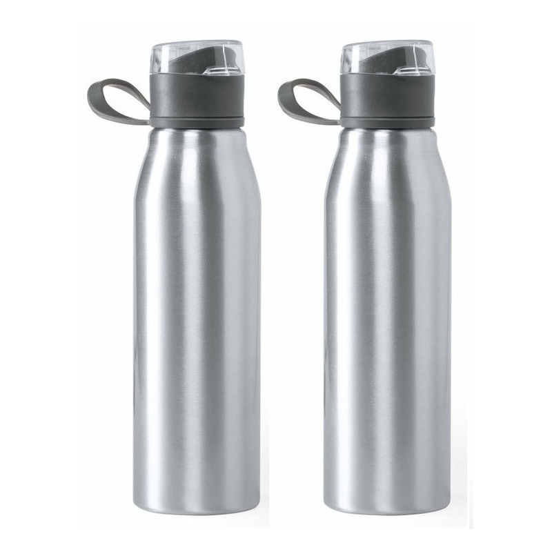 2x aluminium waterfles/drinkfles in de kleur metallic zilver met veiligheid schroefdop. Afmeting: ca. D7,5 x H22 cm. Inhoud: ca. 700 ml. Gewicht: ca. 175 gram. Materiaal fles: Aluminium. Geschikt voor magnetron: nee. Geschikt voor vaatwasser: nee. Geschikt voor vriezer: nee. Wordt geleverd in een kartonnen design cadeau doos.